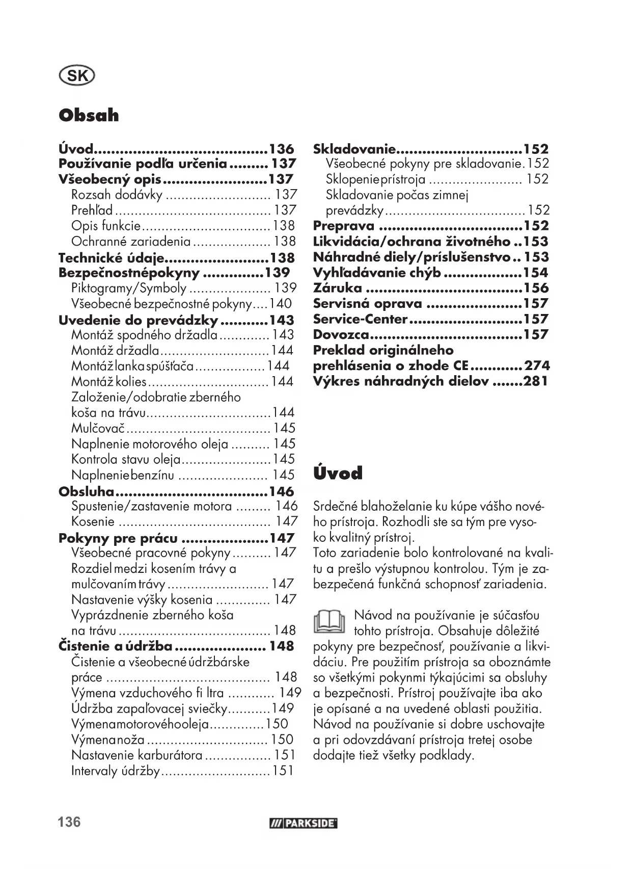 - Výkres náhradných dielov Úvod Srdečné blahoželanie ku kúpe vášho nové- ho prístroja. Rozhodli ste sa tým pre vyso- ko kvalitný prístroj. Toto zariadenie bolo kontrolované na kvali- tu a prešlo výstupnou kontrolou. Tým je za- bezpečená funkčná schopnosť zariadenia. Návod na používanie je súčasťou tohto prístroja. Obsahuje dôležité pokyny pre bezpečnosť, používanie a likvi- dáciu. Pre použitím prístroja sa oboznámte so všetkými pokynmi týkajúcimi sa obsluhy a bezpečnosti. Prístroj používajte iba ako je opísané a na uvedené oblasti použitia. Návod na používanie si dobre uschovajte a pri odovzdávaní prístroja tretej osobe dodajte tiež všetky podklady.137 p. 281