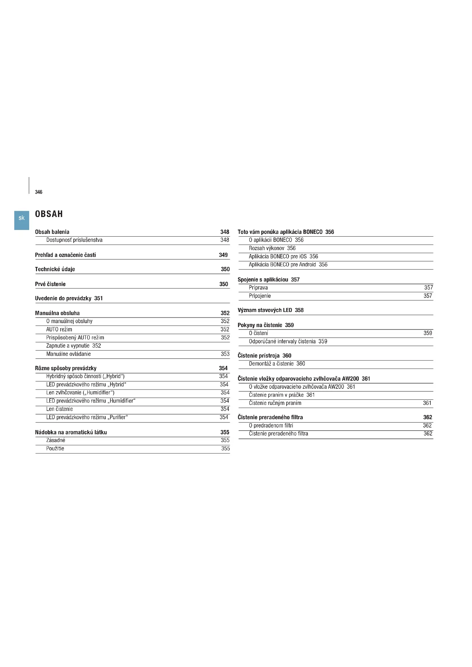 Toto vám ponúka aplikácia BONECO 356 Oaplikácii BONECO 356 Rozsah výkonov 356 Aplikácia BONECO pre iOS 356 Aplikácia BONECO pre Android 356 Spojenie saplikáciou 357 Príprava 357 Pripojenie 357 Význam stavových LED 358 Pokyny na čistenie 359 Očistení 359 Odporúčané intervaly čistenia 359 Čistenie prístroja 360 Demontáž ačistenie 360 Čistenie vložky odparovacieho zvlhčovača AW200 361 Ovložke odparovacieho zvlhčovača AW200 361 Čistenie praním vpráčke 361 Čistenie ručným praním 361 Čistenie preradeného filtra 362 Opredradenom filtri 362 Čistenie preradeného filtra 362 Obsah balenia 348 Dostupnosť príslušenstva 348 Prehľad aoznačenie častí 349 Technické údaje 350 Prvé čistenie 350 Uvedenie do prevádzky 351 Manuálna obsluha 352 Omanuálnej obsluhy 352 AUTO režim 352 Prispôsobený AUTO režim 352 Zapnutie avypnutie 352 Manuálne ovládanie 353 Rôzne spôsoby prevádzky 354 Hybridný spôsob činnosti („Hybrid“) 354 LED prevádzkového režimu „Hybrid“ 354 Len zvlhčovanie („Humidifier“) 354 LED prevádzkového režimu „Humidifier“ 354 Len čistenie 354 LED prevádzkového režimu „Purifier“ 354 Nádobka na aromatickú látku 355 Zásadné 355 Použitie 355 OBSAHVýmena príslušenstva 363 Výmena antibakteriálnej tyčinky Ionic Silver Stick