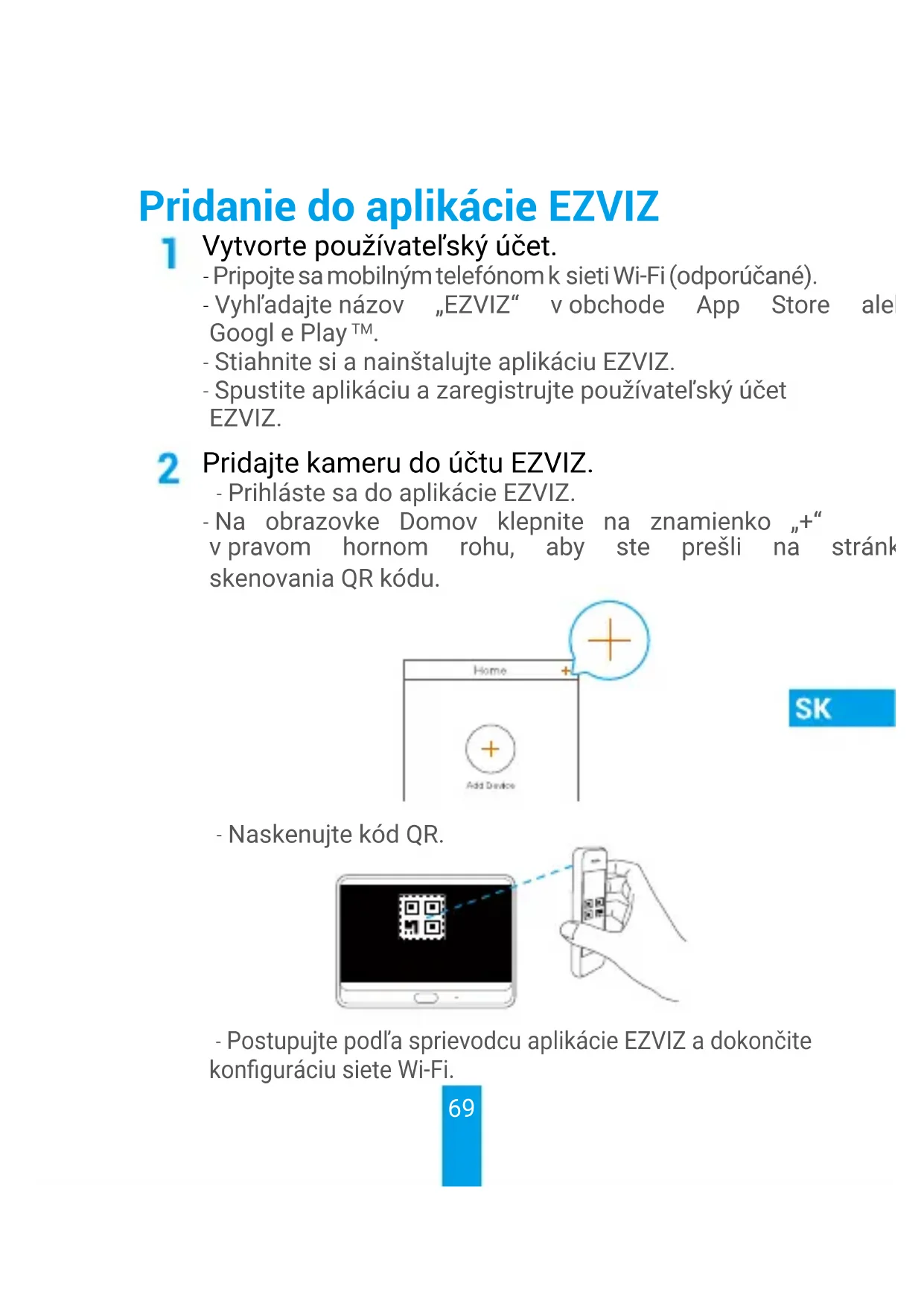 - Nanabíjanie panelapoužívajte výhradnenapájacíadaptér, inakmôžedôjsťkpoškodeniusystému. Obsah balenia Kamera (1 x) Panel (1 x) Montážnazákladňa(1x) Napájací adaptér (1 x) Skrutky (6 x) Kábel (1 x) Príručkasostručným návodom (1 x)65 Prehľad Panel Tlačidlonapájania Obrazovka displeja Zásuvka na kartu MicroSD TlačidloDomov Port napájania ReproduktorTlačidlodemontáže Kamera Snímač Zvonček Snímač Reproduktor Objektív Mikrofón66 Montážna základňa Montážnyotvor Montáž Akužmátepriezor,nainštalujtezariadenienarovnakémiesto. V opačnom prípade vyvŕtajte otvor s priemerom približne 18mmvovzdialenostipribližne145cmodzeme,abystemali dobrýpozorovacíuhol. Zmerajte hrúbku dverí a vybertepríslušnúskrutku. Hrúbka Skrutka 35až60mm 60až95mm 95až105mm67 Skrutku naskrutkujte do zadnejčastikamery. Odrhniteochrannýpapier. Skrutkuakábelprevlečtecez dvere.Akopomôckumôžete použiťzrolovanýpapier. Upravte polohu kamery a jemne jupotlačteblízkokudverám. Skrutkuakábelprevlečtecez montážnuzákladňu. Nastavtepolohumontážnej základne a utiahnite skrutku.68 Pripojte kábel kamery k panelu. Vložtepaneldo montážnejzákladne. Podržtetlačidlodemontáže,kým niejepanelsprávnevsunutý. Inštaláciajedokončená. Zapnutie Podržanímtlačidlanapájania na 3 sekundy zapnite panel. Ťuknutím na tlačidlo Domov zobrazíteživýnáhľad.69 Pridanie do aplikácie EZVIZ Vytvortepoužívateľskýúčet. - PripojtesamobilnýmtelefónomksietiWi-Fi(odporúčané). - Vyhľadajtenázov „EZVIZ“ vobchode App Store alebo Googl e Play