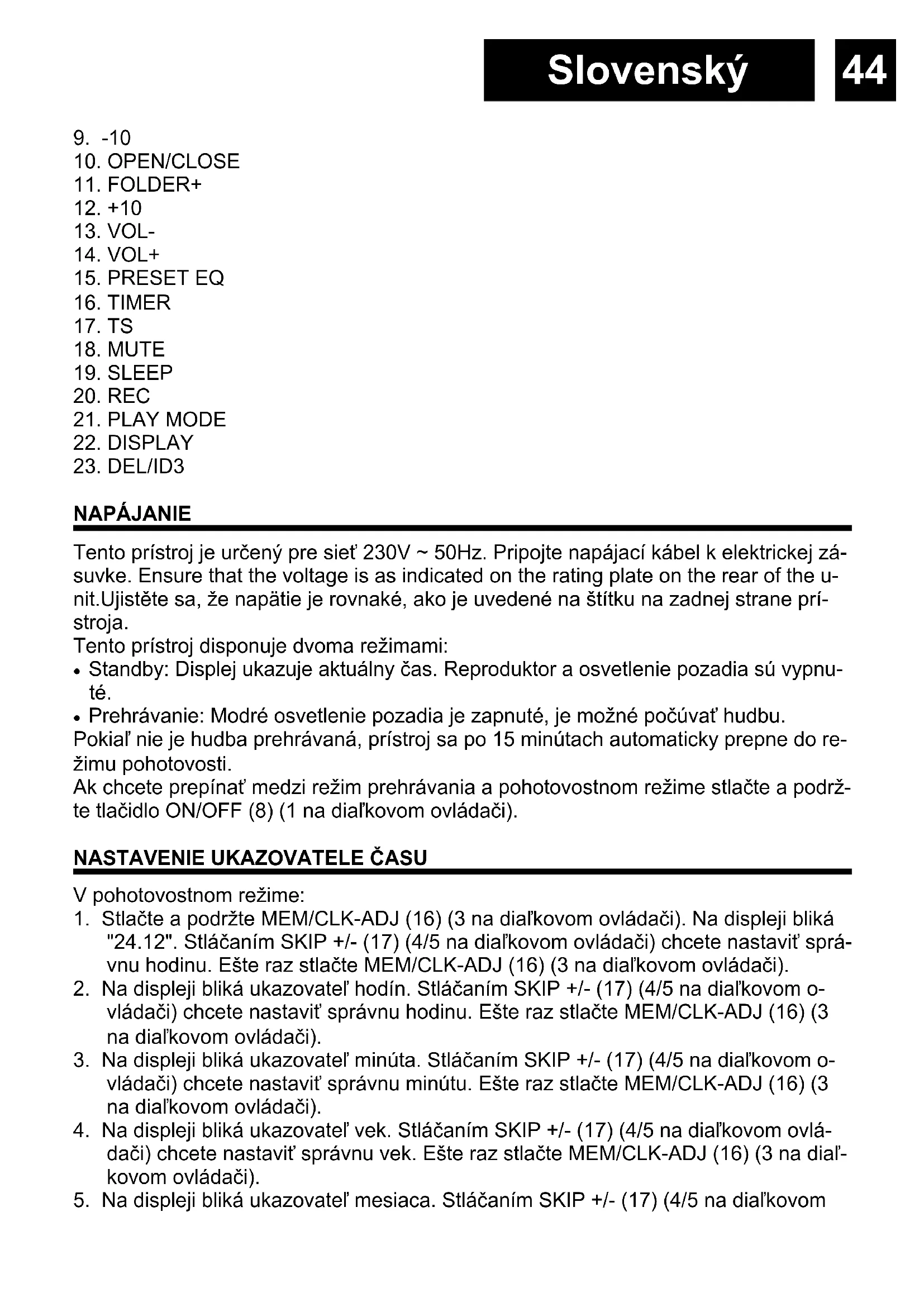 Tento przystroi je určeny pre siet' 230V ~ 50Hz. Pripojte napájací kabel k elektrickej zá-suvke. Ensure that the voltage is as indicated on the rating plate on the rear of the unit.Ujistěte sa, ze napatie je rovnaké, ako je uvedené na štitku na zadnej strane przystroja.