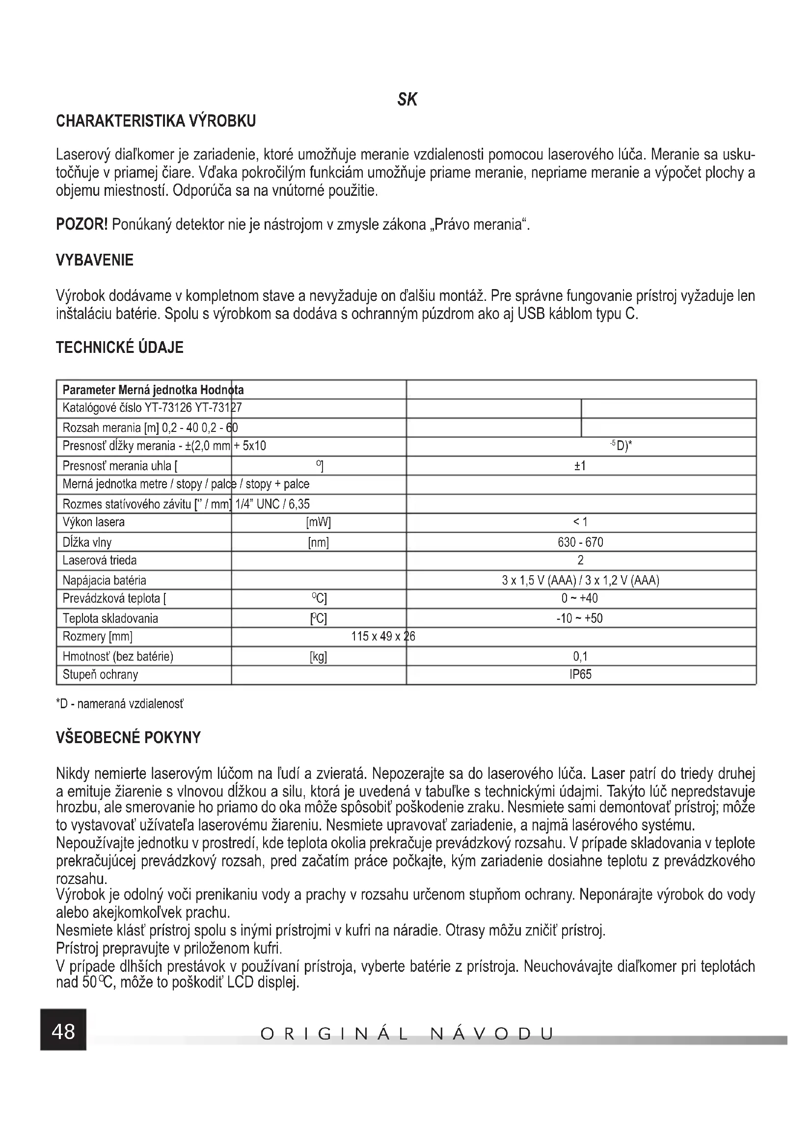 Laserový diaľkomer je zariadenie, ktoré umožňuje meranie vzdialenosti pomocou laserového lúča. Meranie sa usku- točňuje v priamej čiare. Vďaka pokročilým funkciám umožňuje priame meranie, nepriame meranie a výpočet plochy a objemu miestností. Odporúča sa na vnútorné použitie. POZOR! Ponúkaný detektor nie je nástrojom v zmysle zákona „Právo merania“. VYBAVENIE Výrobok dodávame v kompletnom stave a nevyžaduje on ďalšiu montáž. Pre správne fungovanie prístroj vyžaduje len inštaláciu batérie. Spolu s výrobkom sa dodáva s ochranným púzdrom ako aj USB káblom typu C. TECHNICKÉ ÚDAJE Parameter Merná jednotka Hodnota Katalógové číslo YT-73126 YT-73127 Rozsah merania [m] 0,2 - 40 0,2 - 60 Presnosť dĺžky merania - ±(2,0 mm + 5x10