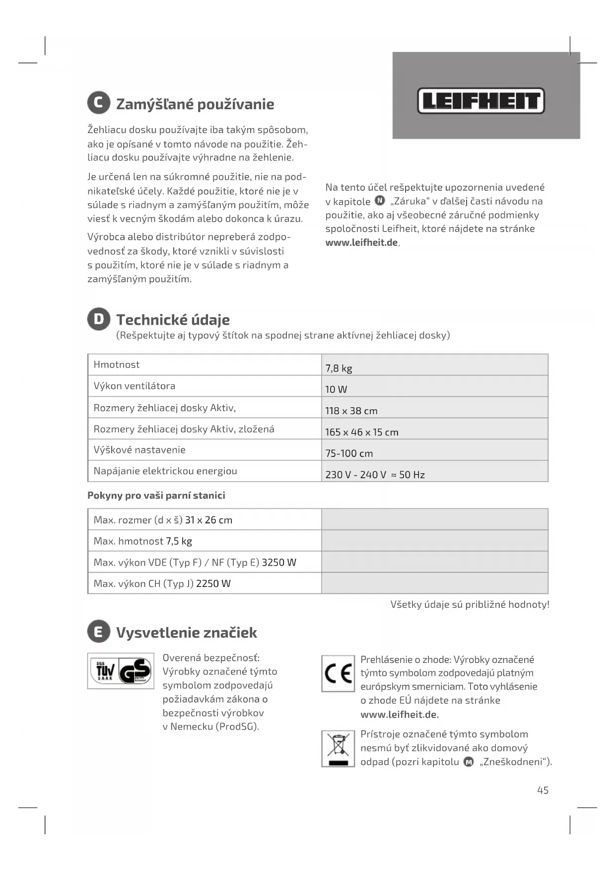 O45 Hmotnost 7,8 kg Výkon ventilátora 10 W RozmeryžehliacejdoskyAktiv, 118 x 38 cm RozmeryžehliacejdoskyAktiv,zložená 165 x 46 x 15 cm Výškové nastavenie 75-100 cm Napájanie elektrickou energiou 230 V - 240 V ≈50Hz Žehliacudoskupoužívajteibatakýmspôsobom, akojeopísanévtomtonávodenapoužitie.Žeh- liacudoskupoužívajtevýhradnenažehlenie. Jeurčenálennasúkromnépoužitie,nienapod- nikateľskéúčely.Každépoužitie,ktoréniejev súladesriadnymazamýšľanýmpoužitím,môže viesťkvecnýmškodámalebodokoncakúrazu. Výrobca alebo distribútor nepreberá zodpo- vednosťzaškody,ktorévzniklivsúvislosti spoužitím,ktoréniejevsúladesriadnyma zamýšľanýmpoužitím. Natentoúčelrešpektujteupozorneniauvedené v kapitole „Záruka“vďalšejčastinávoduna použitie,akoajvšeobecnézáručnépodmienky spoločnostiLeifheit,ktorénájdetenastránke www.leifheit.de