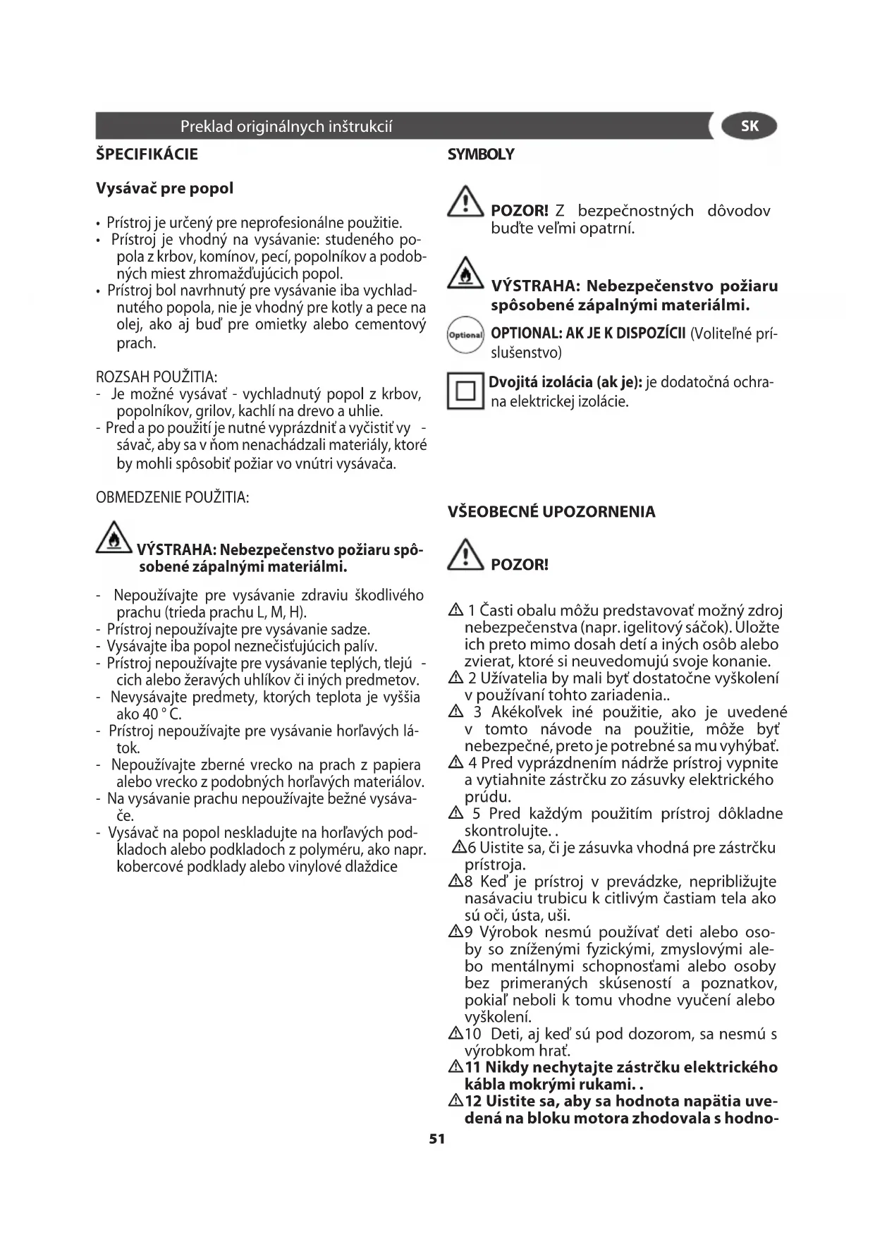 sávač, aby sa v ňom nenachádzali materiály, ktoré by mohli spôsobiť požiar vo vnútri vysávača. OBMEDZENIE POUŽITIA: VÝSTRAHA: Nebezpečenstvo požiaru spô- sobené zápalnými materiálmi. - Nepoužívajte pre vysávanie zdraviu škodlivého prachu (trieda prachu L, M, H). - Prístroj nepoužívajte pre vysávanie sadze. - Vysávajte iba popol neznečisťujúcich palív. - Prístroj nepoužívajte pre vysávanie teplých, tlejú