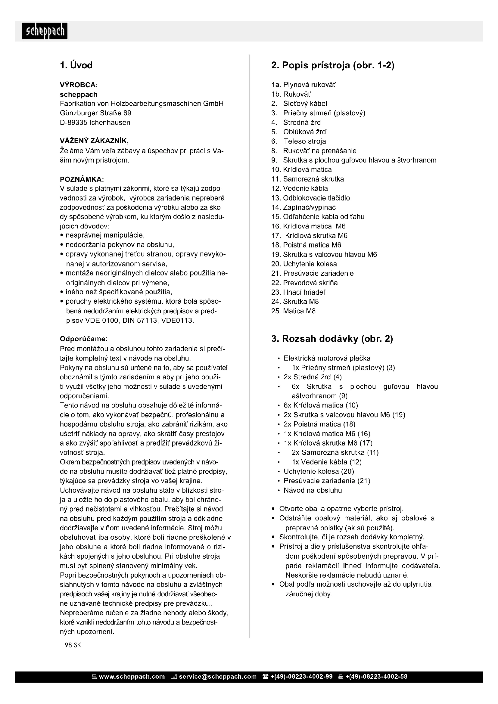 - poruchy elektrického systému, ktorá bola spôso- bená nedodržaním elektrických predpisov a pred- pisov VDE 0100, DIN 57113, VDE0113. Odporúčame: Pred montážou a obsluhou tohto zariadenia si prečí- tajte kompletný text v návode na obsluhu. Pokyny na obsluhu sú určené na to, aby sa používateľ oboznámil s týmto zariadením a aby pri jeho použi- tí využil všetky jeho možnosti v súlade s uvedenými odporučeniami. Tento návod na obsluhu obsahuje dôležité informá- cie o tom, ako vykonávať bezpečnú, profesionálnu a hospodárnu obsluhu stroja, ako zabrániť rizikám, ako ušetriť náklady na opravy, ako skrátiť časy prestojov a ako zvýšiť spoľahlivosť a predĺžiť prevádzkovú ži- votnosť stroja. Okrem bezpečnostných predpisov uvedených v návo- de na obsluhu musíte dodržiavať tiež platné predpisy, týkajúce sa prevádzky stroja vo vašej krajine. Uchovávajte návod na obsluhu stále v blízkosti stro- ja a uložte ho do plastového obalu, aby bol chráne- ný pred nečistotami a vlhkosťou. Prečítajte si návod na obsluhu pred každým použitím stroja a dôkladne dodržiavajte v ňom uvedené informácie. Stroj môžu obsluhovať iba osoby, ktoré boli riadne preškolené v jeho obsluhe a ktoré boli riadne informované o rizi- kách spojených s jeho obsluhou. Pri obsluhe stroja musí byť splnený stanovený minimálny vek. Popri bezpečnostných pokynoch a upozorneniach ob- siahnutých v tomto návode na obsluhu a zvláštnych predpisoch vašej krajiny je nutné dodržiavať všeobec- ne uznávané technické predpisy pre prevádzku.. Nepreberáme ručenie za žiadne nehody alebo škody, ktoré vznikli nedodržaním tohto návodu a bezpečnost- ných upozornení.99 www.scheppach.com service@scheppach.com +(49)-08223-4002-99 +(49)-08223-4002-58 99SK www.scheppach.com service@scheppach.com +(49)-08223-4002-99 +(49)-08223-4002-58