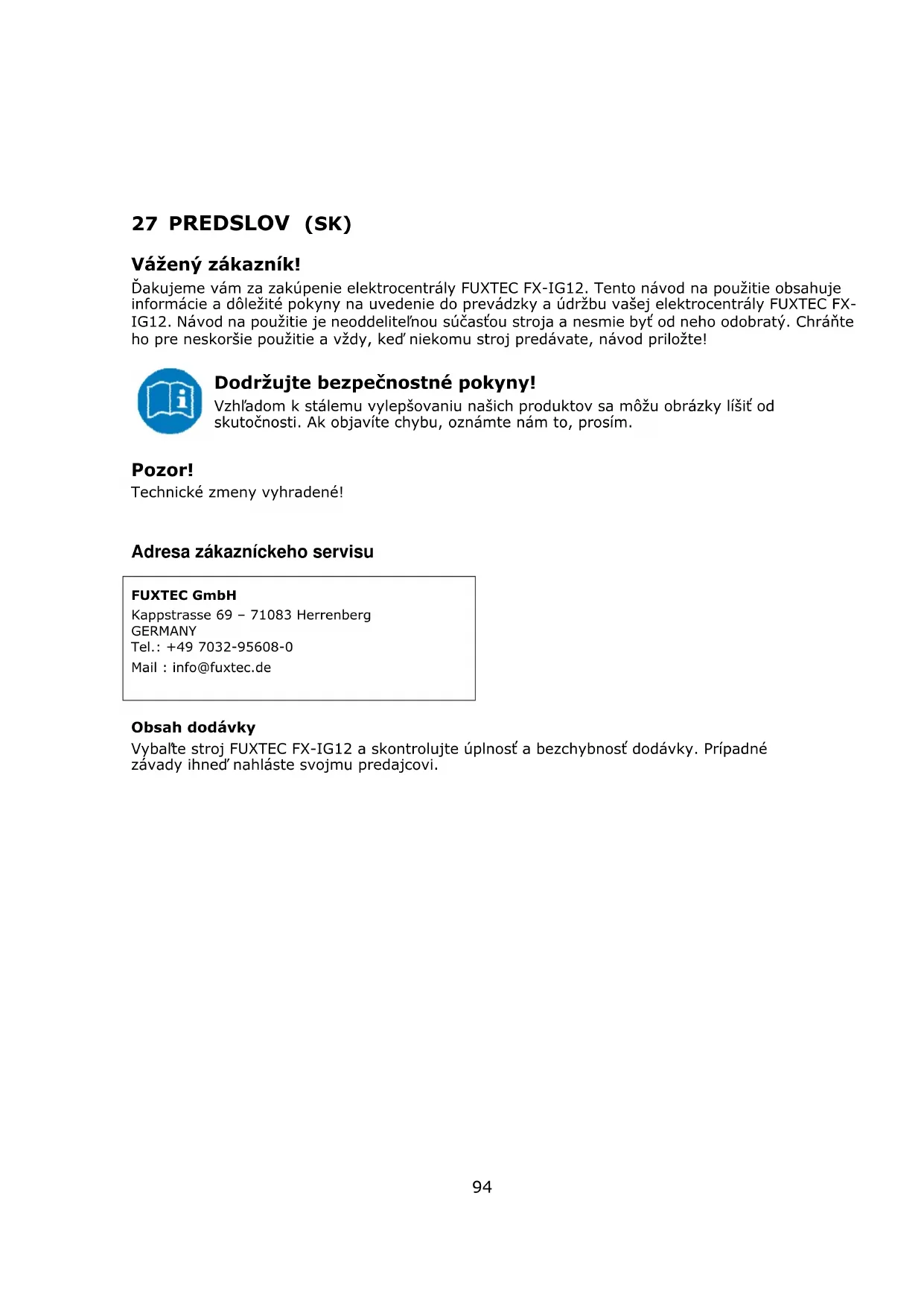 Adresa zákazníckeho servisu Obsah dodávky Vybaľte stroj FUXTEC FX-IG12 a skontrolujte úplnosť a bezchybnosť dodávky. Prípadné závady ihneď nahláste svojmu predajcovi. FUXTEC GmbH Kappstrasse 69 – 71083 Herrenberg GERMANY Tel.: +49 7032-95608-0 Mail : info@fuxtec.de95