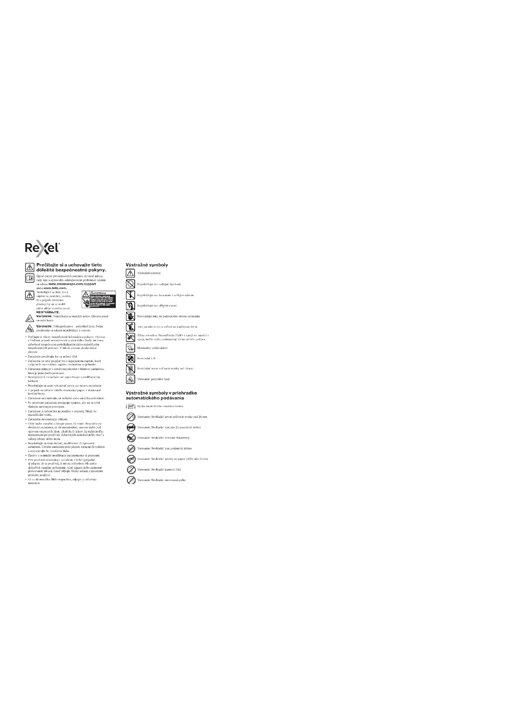 - Nedodržanie týchto pokynov môže viesť k poškodeniu alebo úrazu a spôsobí stratu platnosti záruky. Prečítajte si a uchovajte tieto dôležité bezpečnostné pokyny. Úplné znenie prevádzkových pokynov, servisné adresy, rady, tipy a sprievodcu odstraňovaním problémov nájdete na adrese www.rexeleurope.com/support alebo www.leitz.com. Nepribližujte sa s voľnými šperkami Nepribližujte sa s kravatami a voľnými odevmi Výstražné symboly Nepribližujte sa s dlhými vlasmi Nevkladajte ruky do podávacieho otvoru zariadenia Výstražné symboly Maximálny počet hárkov Nevkladať CD Nevkladať pevné zošívacie svorky nad 26 mm Varovanie: pohyblivé časti Varovanie: Nedotýkajte sa rezacích nožov. Dávajte pozor na ostré hrany. Varovanie: Nebezpečenstvo – pohyblivé časti. Počas používania sa rukami nepribližujte k valcom. Toto zariadenie nie je určené na používanie deťmi Zákaz aerosólov. Nepoužívajte čističe v spreji ani mazivá v spreji, keďže môžu predstavovať riziko náhleho požiaru. Varovanie: Nevkladať pevné zošívacie svorky nad 26 mm Varovanie: Nevkladať zviazané dokumenty Varovanie: Nevkladať viac ako 25 zopnutých hárkov Výstražné symboly v priehradke automatického podávania Varovanie: Nevkladať viac zložených hárkov Varovanie: Nevkladať sponky na papier väčšie ako 32 mm Ryska maximálneho množstva hárkov Varovanie: Nevkladať časopisy Varovanie: Nevkladať papier alebo kartón hrubší ako 200 g/m