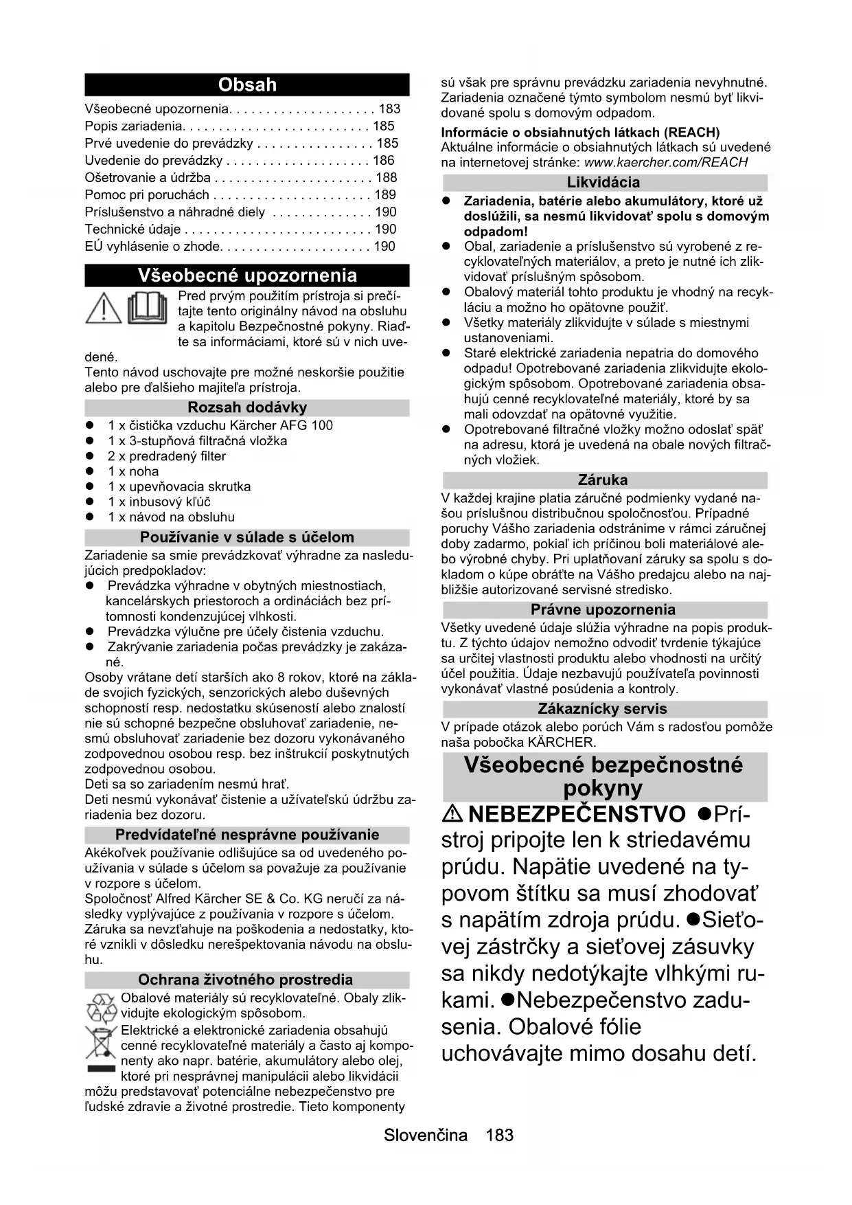 - dB(A) 37 - 65 Hmotnost kg 13 Výška mm 1120 Průměr základové desky mm 320 Okolní teplota °C 10 - 30 Relativní vlhkost vzduchu % 20 - 80 Chairman of the Board of ManagementDirector Regulatory Affairs & Certification H. Jenner S. ReiserSlovenčina 183 Obsah Všeobecné upozornenia Pred prvým použitím prístroja si prečí- tajte tento originálny návod na obsluhu a kapitolu Bezpečnostné pokyny. Riaď- te sa informáciami, ktoré sú v nich uve- dené. Tento návod uschovajte pre možné neskoršie použitie alebo pre ďalšieho majiteľa prístroja. Rozsah dodávky 1 x čistička vzduchu Kärcher AFG 100 1 x 3-stupňová filtračná vložka 2 x predradený filter 1 x noha 1 x upevňovacia skrutka 1 x inbusový kľúč 1 x návod na obsluhu Používanie v súlade s účelom Zariadenie sa smie prevádzkovať výhradne za nasledu- júcich predpokladov: Prevádzka výhradne v obytných miestnostiach, kancelárskych priestoroch a ordináciách bez prí- tomnosti kondenzujúcej vlhkosti. Prevádzka výlučne pre účely čistenia vzduchu. Zakrývanie zariadenia počas prevádzky je zakáza- né. Osoby vrátane detí starších ako 8 rokov, ktoré na zákla- de svojich fyzických, senzorických alebo duševných schopností resp. nedostatku skúseností alebo znalostí nie sú schopné bezpečne obsluhovať zariadenie, ne- smú obsluhovať zariadenie bez dozoru vykonávaného zodpovednou osobou resp. bez inštrukcií poskytnutých zodpovednou osobou. Deti sa so zariadením nesmú hrať. Deti nesmú vykonávať čistenie a užívateľskú údržbu za- riadenia bez dozoru. Predvídateľné nesprávne používanie Akékoľvek používanie odlišujúce sa od uvedeného po- užívania v súlade s účelom sa považuje za používanie v rozpore s účelom. Spoločnosť Alfred Kärcher SE & Co. KG neručí za ná- sledky vyplývajúce z používania v rozpore s účelom. Záruka sa nevzťahuje na poškodenia a nedostatky, kto- ré vznikli v dôsledku nerešpektovania návodu na obslu- hu. Ochrana životného prostredia Obalové materiály sú recyklovateľné. Obaly zlik- vidujte ekologickým spôsobom. Elektrické a elektronické zariadenia obsahujú cenné recyklovateľné materiály a často aj kompo- nenty ako napr. batérie, akumulátory alebo olej, ktoré pri nesprávnej manipulácii alebo likvidácii môžu predstavovať potenciálne nebezpečenstvo pre ľudské zdravie a životné prostredie. Tieto komponenty sú však pre správnu prevádzku zariadenia nevyhnutné. Zariadenia označené týmto symbolom nesmú byť likvi- dované spolu s domovým odpadom. Informácie o obsiahnutých látkach (REACH) Aktuálne informácie o obsiahnutých látkach sú uvedené na internetovej stránke: www.kaercher.com/REACH Likvidácia Zariadenia, batérie alebo akumulátory, ktoré už doslúžili, sa nesmú likvidovať spolu s domovým odpadom! Obal, zariadenie a príslušenstvo sú vyrobené z re- cyklovateľných materiálov, a preto je nutné ich zlik- vidovať príslušným spôsobom. Obalový materiál tohto produktu je vhodný na recyk- láciu a možno ho opätovne použiť. Všetky materiály zlikvidujte v súlade s miestnymi ustanoveniami. Staré elektrické zariadenia nepatria do domového odpadu! Opotrebované zariadenia zlikvidujte ekolo- gickým spôsobom. Opotrebované zariadenia obsa- hujú cenné recyklovateľné materiály, ktoré by sa mali odovzdať na opätovné využitie. Opotrebované filtračné vložky možno odoslať späť na adresu, ktorá je uvedená na obale nových filtrač- ných vložiek. Záruka V každej krajine platia záručné podmienky vydané na- šou príslušnou distribučnou spoločnosťou. Prípadné poruchy Vášho zariadenia odstránime v rámci záručnej doby zadarmo, pokiaľ ich príčinou boli materiálové ale- bo výrobné chyby. Pri uplatňovaní záruky sa spolu s do- kladom o kúpe obráťte na Vášho predajcu alebo na naj- bližšie autorizované servisné stredisko. Právne upozornenia Všetky uvedené údaje slúžia výhradne na popis produk- tu. Z týchto údajov nemožno odvodiť tvrdenie týkajúce sa určitej vlastnosti produktu alebo vhodnosti na určitý účel použitia. Údaje nezbavujú používateľa povinnosti vykonávať vlastné posúdenia a kontroly. Zákaznícky servis V prípade otázok alebo porúch Vám s radosťou pomôže naša pobočka KÄRCHER. Všeobecné bezpečnostné pokyny NEBEZPEČENSTVO Prí- stroj pripojte len k striedavému prúdu. Napätie uvedené na ty- povom štítku sa musí zhodovať s napätím zdroja prúdu. Sieťo- vej zástrčky a sieťovej zásuvky sa nikdy nedotýkajte vlhkými ru- kami. Nebezpečenstvo zadu- senia. Obalové fólie uchovávajte mimo dosahu detí. Všeobecné upozornenia p. 183