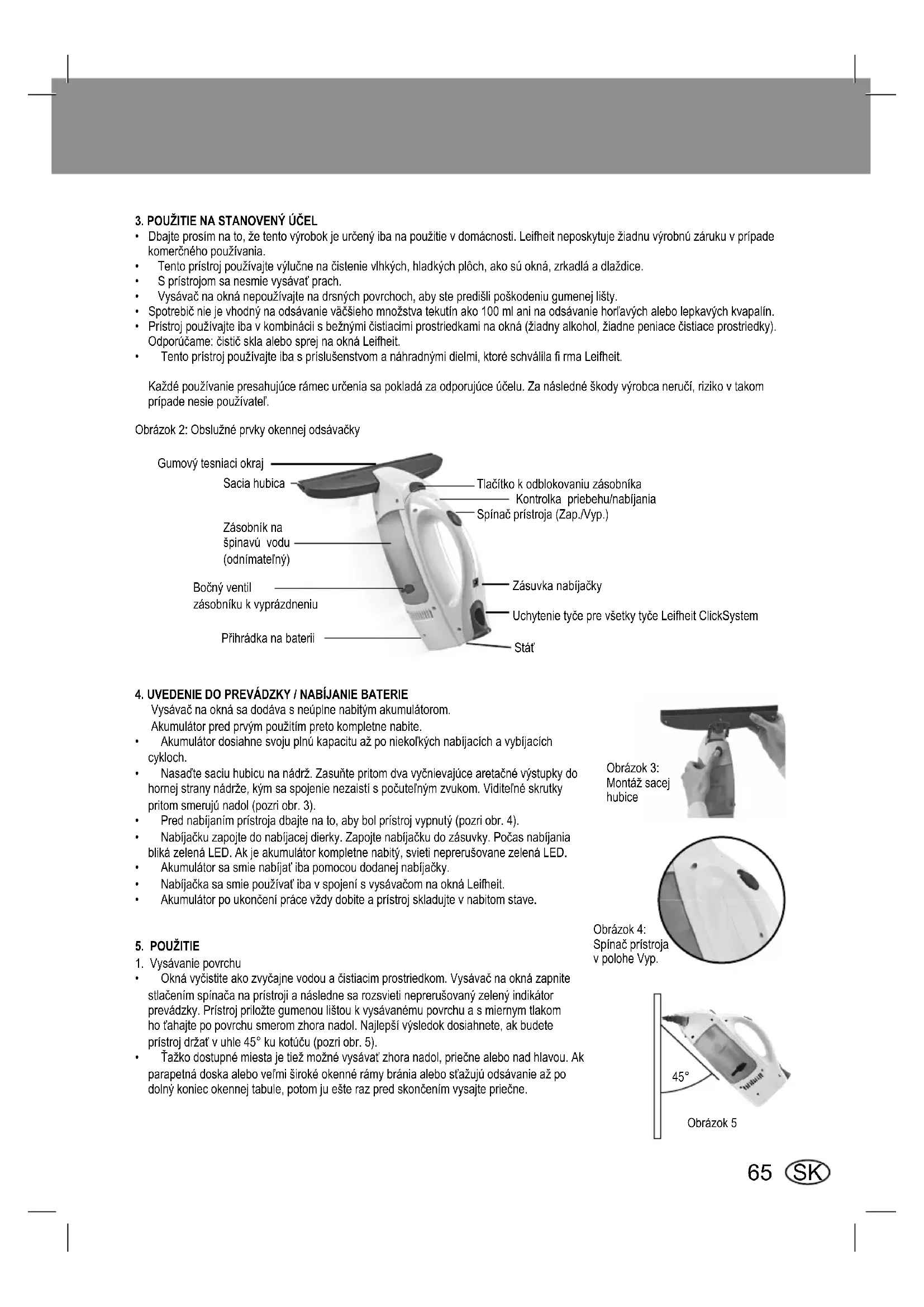 - Oknávyčistiteakozvyčajnevodouačistiacimprostriedkom.Vysávačnaoknázapnite stlačenímspínačanaprístrojianáslednesarozsvietineprerušovanýzelenýindikátor prevádzky.Prístrojpriložtegumenoulištoukvysávanémupovrchuasmiernymtlakom hoťahajtepopovrchusmeromzhoranadol.Najlepšívýsledokdosiahnete,akbudete prístrojdržaťvuhle45°kukotúču(pozriobr.5).