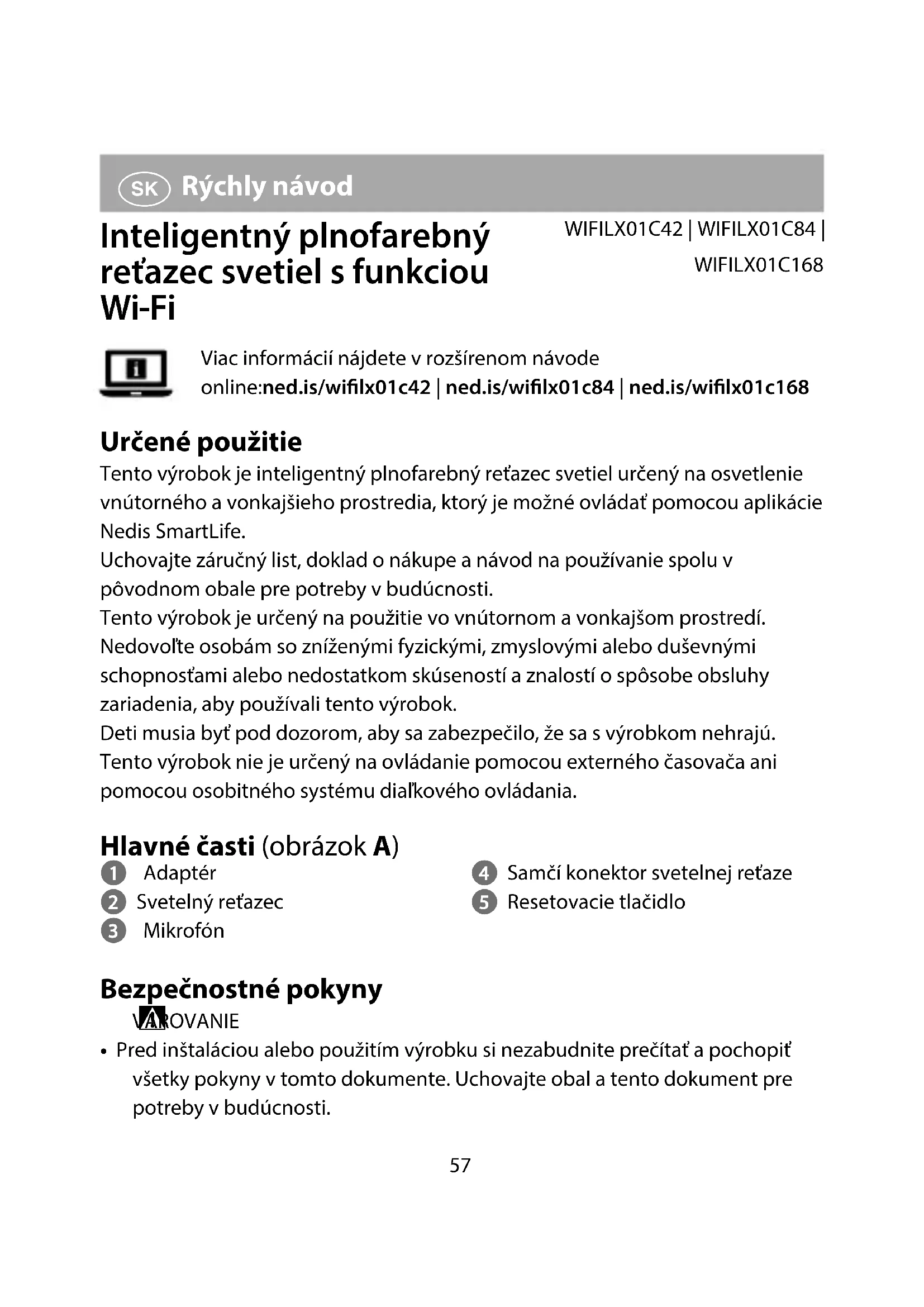 Rýchly návod Inteligentný plnofarebný reťazec svetiel s funkciou Wi-Fi WIFILX01C42 | WIFILX01C84 | WIFILX01C168Viac informácií nájdete v rozšírenom návode online:ned.is/wilx01c42 | ned.is/wilx01c84 | ned.is/wilx01c168 Určené použitie Tento výrobok je inteligentný plnofarebný reťazec svetiel určený na osvetlenie vnútorného a vonkajšieho prostredia, ktorý je možné ovládať pomocou aplikácie Nedis SmartLife.Uchovajte záručný list, doklad o nákupe a návod na používanie spolu v pôvodnom obale pre potreby v budúcnosti.Tento výrobok je určený na použitie vo vnútornom a vonkajšom prostredí.Nedovoľte osobám so zníženými fyzickými, zmyslovými alebo duševnými schopnosťami alebo nedostatkom skúseností a znalostí o spôsobe obsluhy zariadenia, aby používali tento výrobok.Deti musia byť pod dozorom, aby sa zabezpečilo, že sa s výrobkom nehrajú.Tento výrobok nie je určený na ovládanie pomocou externého časovača ani pomocou osobitného systému diaľkového ovládania. Hlavné časti (obrázok A) 1 Adaptér 2 Svetelný reťazec 3 Mikrofón 4 Samčí konektor svetelnej reťaze 5 Resetovacie tlačidlo Bezpečnostné pokyny