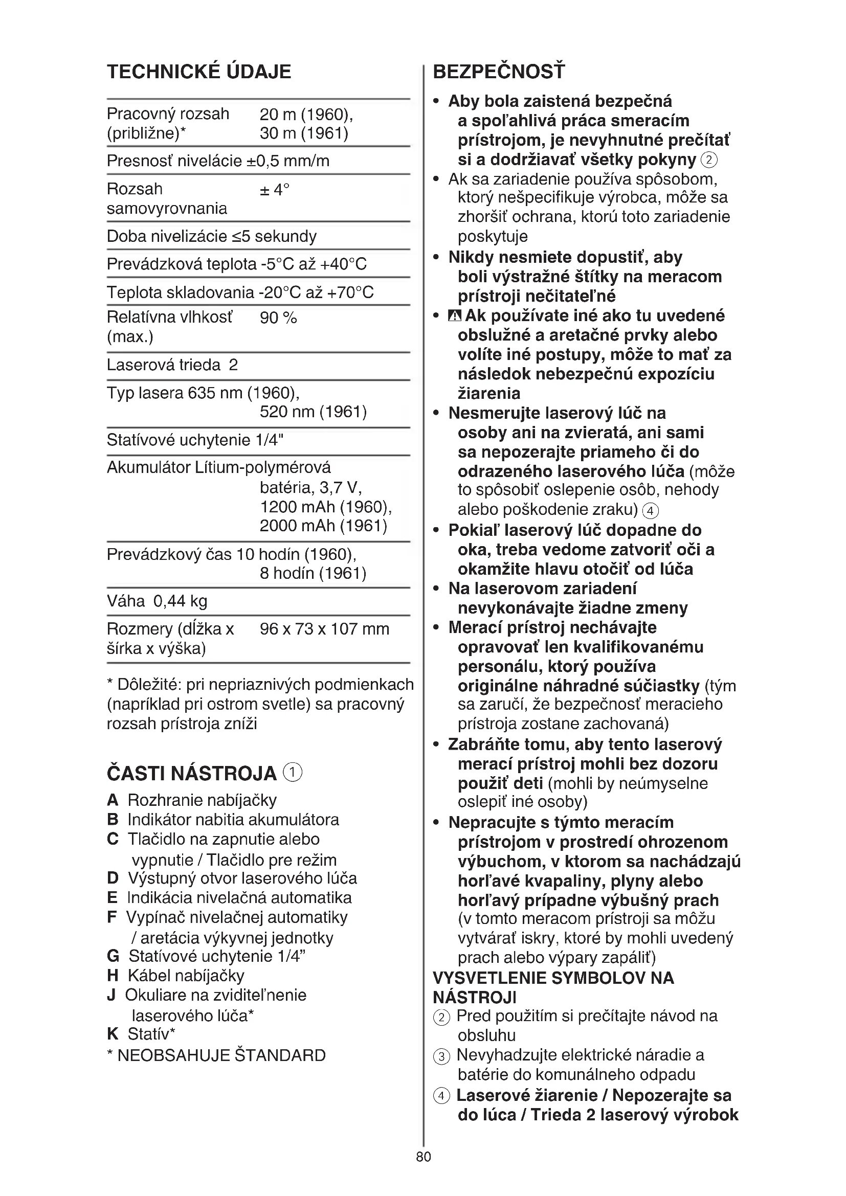 Laserové žiarenie / Nepozerajte sa do lúca / Trieda 2 laserový výrobok TECHNICKÉ ÚDAJE Pracovný rozsah (približne)* 20 m (1960), 30 m (1961) Presnosť nivelácie ±0,5 mm/m Rozsah samovyrovnania ± 4° Doba nivelizácie ≤5 sekundy Prevádzková teplota -5°C až +40°C Teplota skladovania -20°C až +70°C Relatívna vlhkosť (max.) 90 % Laserová trieda 2 Typ lasera 635 nm (1960), 520 nm (1961) Statívové uchytenie 1/4" Akumulátor Lítium-polymérová batéria, 3,7 V, 1200 mAh (1960), 2000 mAh (1961) Prevádzkový čas 10 hodín (1960), 8 hodín (1961) Váha 0,44 kg Rozmery (dĺžka x šírka x výška) 96 x 73 x 107 mm