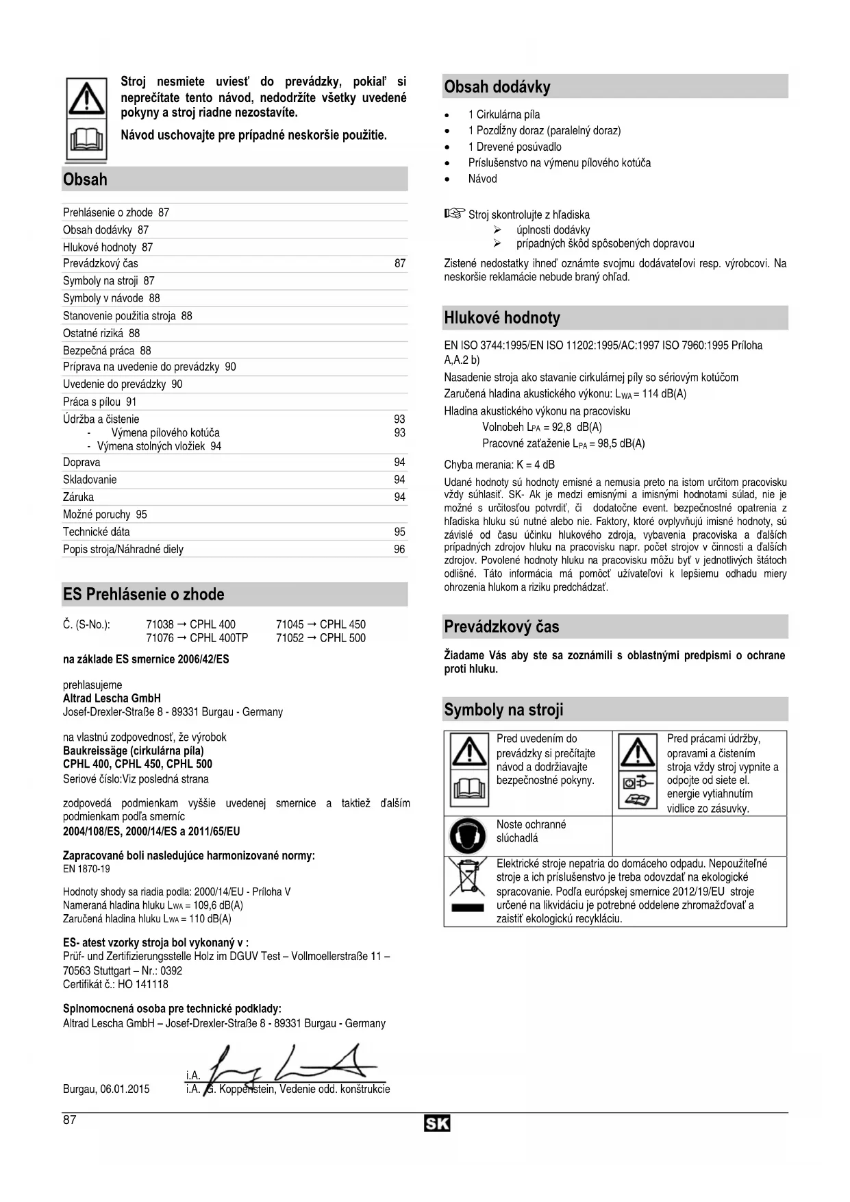 na základe ES smernice 2006/42/ES prehlasujeme Altrad Lescha GmbH Josef-Drexler-Straße 8 - 89331 Burgau - Germany na vlastnú zodpovednosť, že výrobok Baukreissäge (cirkulárna píla)