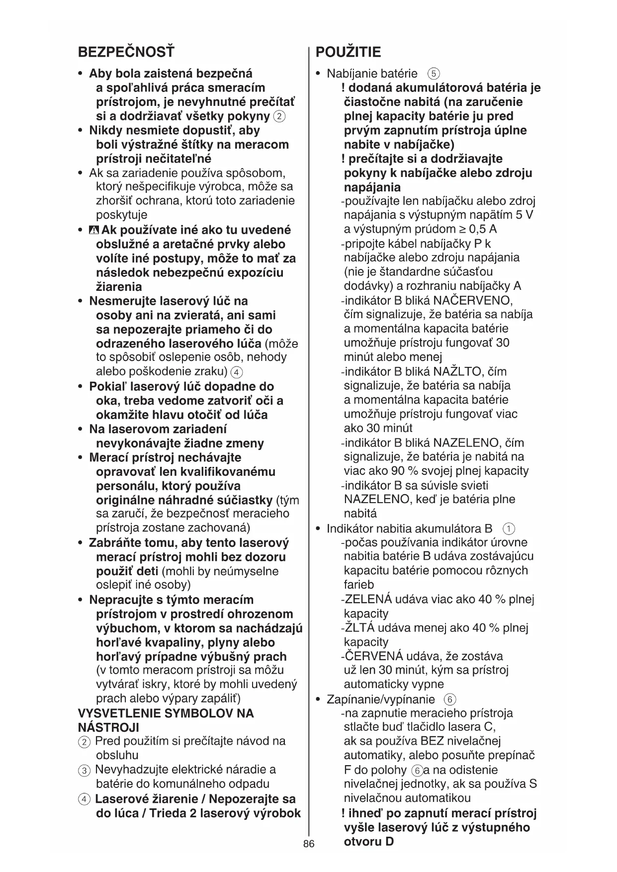 b na zaistenie nivelačnej jednotky, ak sa používa S nivelačnou automatikou - nenechávajte zapnutý merací prístroj bez dozoru a po použití merací prístroj vždy vypnite (laserový lúč by mohol oslepiť iné osoby) - keď merací prístroj nepoužívate, vypnite ho, aby ste ušetrili elektrickú energiu