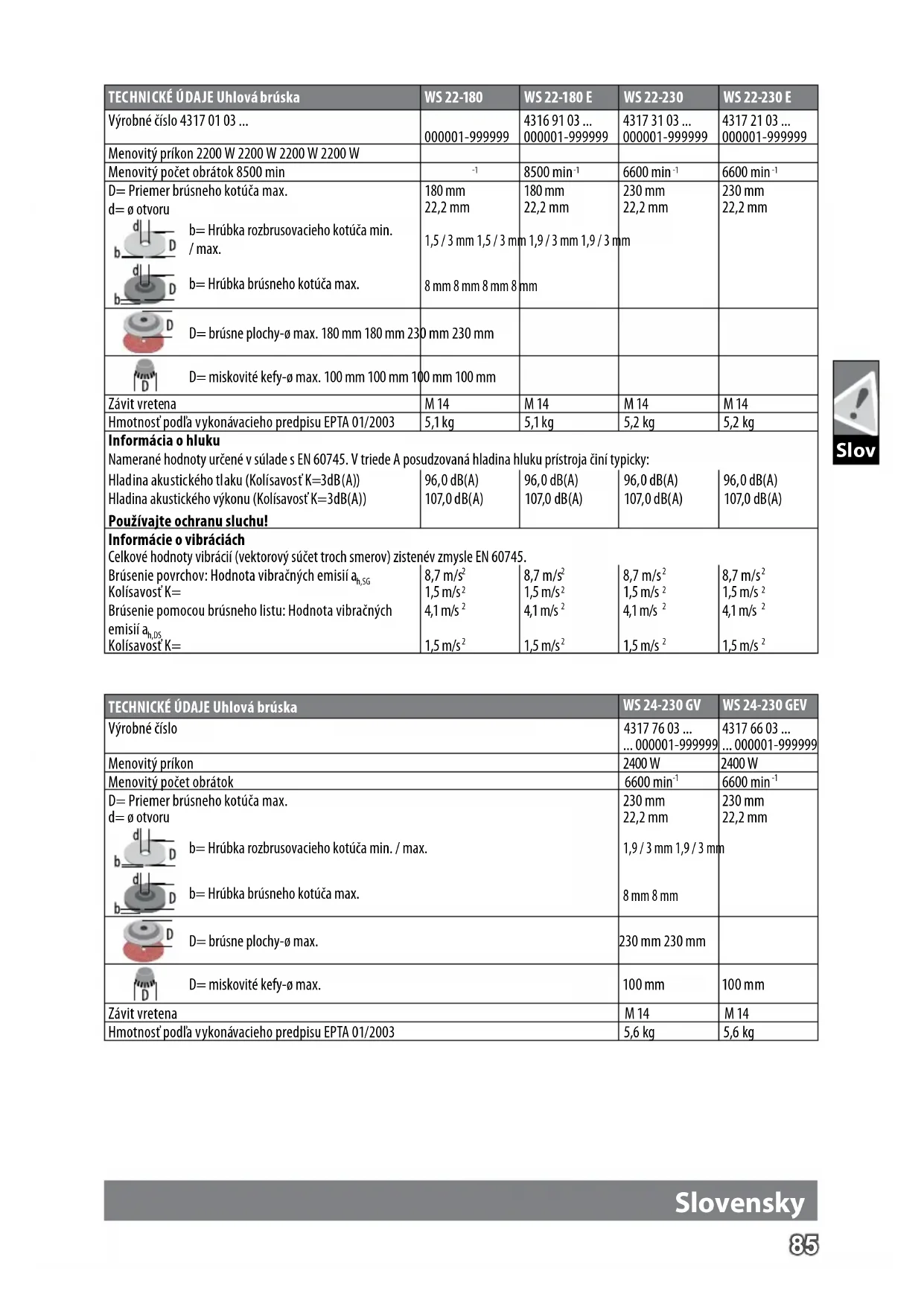 D= Priemer brúsneho kotúča max. d= ø otvoru 180 mm 22,2 mm 180 mm 22,2 mm 230 mm 22,2 mm 230 mm 22,2 mm b= Hrúbka rozbrusovacieho kotúča min. / max. 1,5 / 3 mm 1,5 / 3 mm 1,9 / 3 mm 1,9 / 3 mm b= Hrúbka brúsneho kotúča max. 8 mm 8 mm 8 mm 8 mm D= brúsne plochy-ø max. 180 mm 180 mm 230 mm 230 mm D= miskovité kefy-ø max. 100 mm 100 mm 100 mm 100 mm Závit vretena M 14 M 14 M 14 M 14 Hmotnosť podľa vykonávacieho predpisu EPTA 01/2003 5,1 kg 5,1 kg 5,2 kg 5,2 kg Informácia o hluku Namerané hodnoty určené v súlade s EN 60745. V triede A posudzovaná hladina hluku prístroja činí typicky: Hladina akustického tlaku (Kolísavosť K=3dB(A)) 96,0 dB(A) 96,0 dB(A) 96,0 dB(A) 96,0 dB(A) Hladina akustického výkonu (Kolísavosť K=3dB(A)) Používajte ochranu sluchu! 107,0 dB(A) 107,0 dB(A) 107,0 dB(A) 107,0 dB(A) Informácie o vibráciách Celkové hodnoty vibrácií (vektorový súčet troch smerov) zistenév zmysle EN 60745. Brúsenie povrchov: Hodnota vibračných emisií a h,SG Kolísavosť K= 8,7 m/s