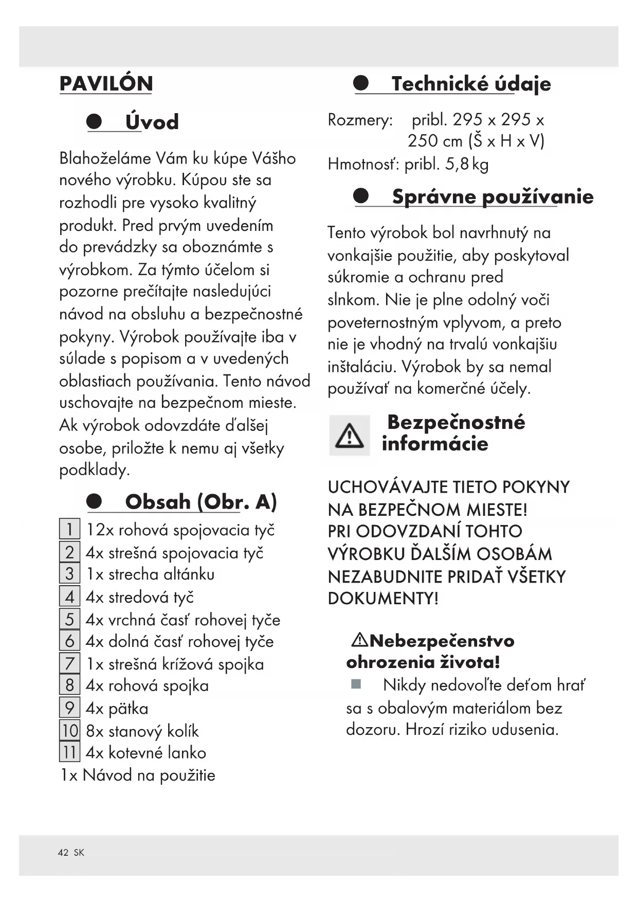 DOKUMENTY! mNebezpečenstvo ohrozenia života! Nikdy nedovoľte deťom hrať sa s obalovým materiálom bez dozoru. Hrozí riziko udusenia.43 SK mNebezpečenstvo poranenia! Výrobok sa nesmie používať za nepriaznivých poveternostných podmienok, ako je silný vietor alebo silný dážď a sneženie. Rozoberte altánok, ak sa očakáva, že rýchlosť vetra presiahne 40 km/h (rýchly a zreteľne počuteľný vietor, pohyb väčších konárov a stromov). Rozložte výrobok, ak sa začne zdvíhať vietor alebo ak sa vyskytnú iné nepriaznivé poveternostné podmienky. Buďte obzvlášť opatrní, aby ste si pri montáži a demontáži výrobku nepricvikli prsty. Mohlo by to spôsobiť zranenie vo forme pomliaždenín. Položte výrobok na rovný povrch. Upozornite ostatné osoby na prítomnosť kotevného lanka a upozornite ich na nebezpečenstvo zakopnutia. Pred použitím sa uistite, že je výrobok úplne roztiahnutý. Výrobok sa môže používať len pod dohľadom dospelých osôb a nie je navrhnutý ako hračka. Pred každým použitím skontrolujte, či výrobok nie je poškodený alebo opotrebovaný. Pred použitím výrobku skontrolujte, či sú všetky prvky správne nainštalované. Nesprávna montáž môže znížiť bezpečnosť a funkčnosť. Vo výrobku ani v jeho blízkosti nepoužívajte otvorený oheň, grily alebo terasové ohrievače. V prípade horenia altánku ho okamžite opustite! Na uhasenie požiaru použite hasiaci prístroj alebo vodu. V prípade potreby bezodkladne zalarmujte hasičský zbor. Jednotlivé altánky sa nesmú navzájom spájať ani pripevňovať k sebe. Medzi jednotlivými altánkami sa musí dodržiavať minimálna vzdialenosť 3 metre. Akékoľvek naplavenia vody sa musia odstrániť! Kotevné lanká sa musia používať v celej dĺžke.44 SK Výber umiestnenia Rozmery výrobku sú 3 x 3 m a bude potrebný ďalší priestor pre kotevné lanká. Všade, kde je to možné, umiestnite výrobok na miesto, kde je chránený pred vetrom. Zem musí byť rovná a musí poskytovať kolíkom dostatočnú stabilitu. Zostavenie Poznámka! Na postavenie výrobku sú potrebné aspoň 2 osoby. Odporúčame, aby montáž vykonávali 4 osoby. Krok 1 (Obr. B) Zložte strešný rám. Spojte každú zo stredových tyčí [4] dvoma rohovými spojovacími tyčami [1] a rohovou spojkou [8]. Uistite sa, že zaisťovacie mechanizmy [1] viditeľne aj počuteľne zapadnú do otvorov v rohovej spojke. mVýstraha! Riziko zachytenia rúk alebo prstov! Krok 2 (Obr. C) Zasuňte posledné štyri rohové spojovacie tyče do rohovej spojky. Zasuňte štyri strešné spojovacie tyče [2] a pripojte ich k strešnej krížovej spojke [7]. Uistite sa, že zaisťovacie mechanizmy [1] viditeľne aj počuteľne zapadnú do otvorov v rohovej spojke. mVýstraha! Riziko zachytenia rúk alebo prstov! Krok 3 (Obr. D) Zasuňte horné rohové tyče [5] do rohovej spojky [8]. Krok 4 (Obr. E) Natiahnite strechu altánku [3] cez rám. Pripevnite strechu na miesto pomocou predinštalovaných suchých zipsov [] na ráme strechy. Krok 5 (Obr. F) Zasuňte spodné rohové tyče [6] do horných rohových tyčí a pätiek [9]. Upevnite strešné slučky [] do jedného z vyvŕtaných otvorov v spodnej rohovej tyči.45 SK Krok 6 (Obr. G) Ukotvite každú nohu pomocou stanových kolíkov []. Na tento účel použite otvory v nohách. Uzlom spojte jeden koniec každého kotevného lanka [] so strešnou slučkou [] na vonkajších rohoch výrobku. mVýstraha! Kotevné lanká roztiahnite na celú dĺžku, aby ste dosiahli vysokú úroveň stability a každý koniec pripevnite pomocou jedného stanového kolíka. mVýstraha! Skontrolujte, či sú stanové kolíky pevne pripevnené. Rozloženie Krok 1 Uvoľnite stanové kolíky, ktoré držia kotevné lanká a pätky. Krok 2 Uvoľnite strešné slučky zo spodných rohových tyčí. Vyberte pätky a spodné rohové tyče. Krok 3 Dajte dole strechu a horné rohové tyče. Krok 4 Rozložte strešný rám. Stlačte zaisťovací mechanizmus, aby ste uvoľnili tyče z rohových spojok. mVýstraha! Riziko zachytenia rúk alebo prstov! Krok 5 Pred uskladnením sa uistite, že je výrobok čistý a suchý. Čistenie a starostlivosť Výrobok čistite vlhkou handričkou a jemným čistiacim prostriedkom. Nepoužívajte benzín, rozpúšťadlá ani silné čistiace prostriedky. Skladovanie Aby ste si výrobok mohli užívať čo najdlhšie, v prípade, že sa nepoužíva, odporúčame ho vždy skladovať v suchom a čistom stave pri izbovej teplote.46 SK Likvidácia Obal pozostáva z ekologických materiálov, ktoré môžete odovzdať na miestnych recyklačných zberných miestach. O možnostiach likvidácie opotrebovaného výrobku sa môžete informovať na Vašej obecnej alebo mestskej správe. Záruka Tento výrobok bol dôkladne vyrobený podľa prísnych akostných smerníc a pred dodaním svedomito testovaný. V prípade nedostatkov tohto výrobku Vám prináležia zákonné práva voči predajcovi produktu. Tieto zákonné práva nie sú našou nižšie uvedenou zárukou obmedzené. Na tento produkt poskytujeme 3-ročnú záruku od dátumu nákupu. Záručná doba začína plynúť dátumom kúpy. Starostlivo si prosím uschovajte originálny pokladničný lístok. Tento doklad je potrebný ako dôkaz o kúpe. Ak sa v rámci 3 rokov od dátumu nákupu tohto výrobku vyskytne chyba materiálu alebo výrobná chyba, výrobok Vám bezplatne opravíme alebo vymeníme – podľa nášho výberu. Táto záruka zaniká, ak bol produkt poškodený, neodborne používaný alebo neodborne udržiavaný. Poskytnutie záruky sa vzťahuje na chyby materiálu a výrobné chyby. Táto záruka sa nevzťahuje na časti produktu, ktoré sú vystavené normálnemu opotrebovaniu, a preto ich je možné považovať za opotrebovateľné diely (napr. batérie) alebo na poškodenia na rozbitných dieloch, napr. na spínači, akumulátorových batériach alebo častiach, ktoré s