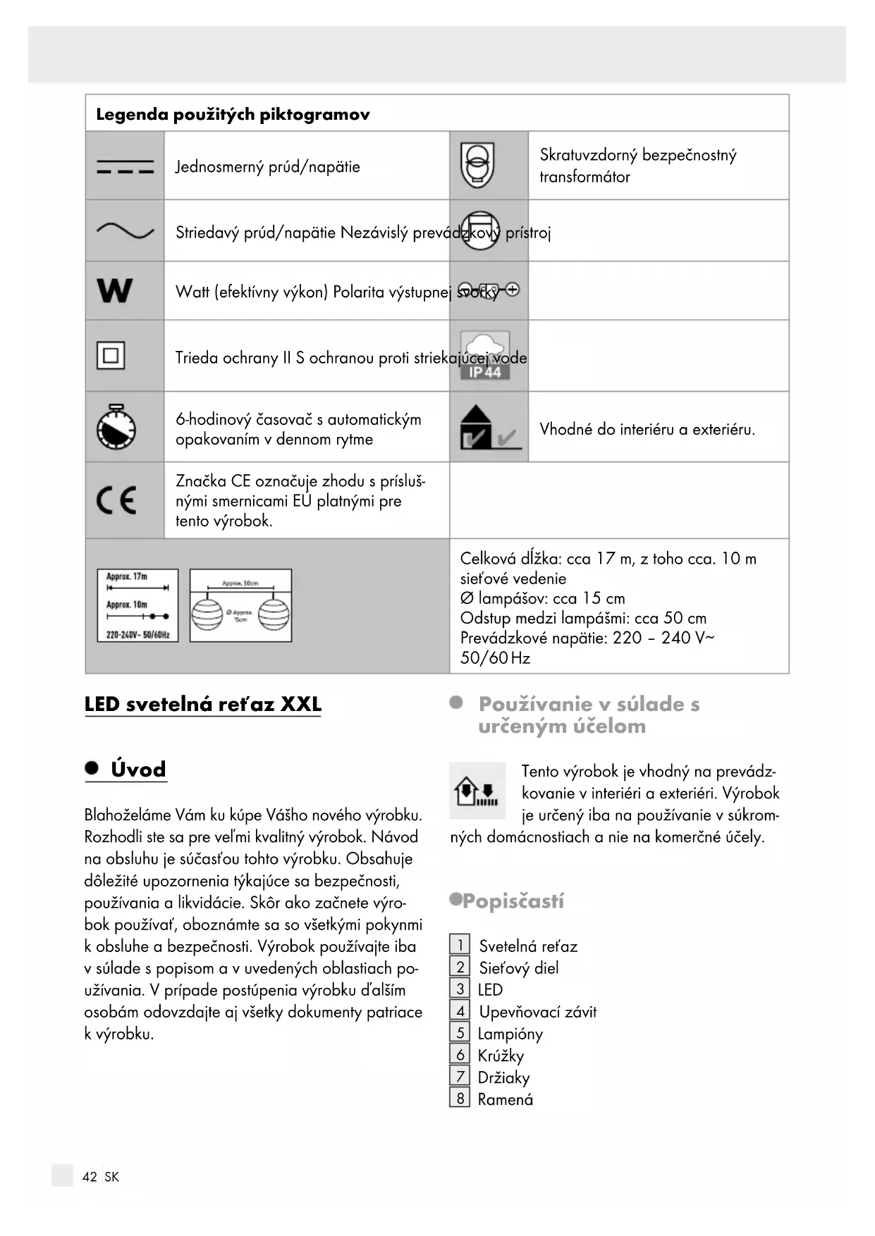 Tlačidlo Timer Technické údaje Svetelná reťaz + sieťový diel: Celkový príkon: cca. 2,0 W Svetelná reťaz: Prevádzkové napätie: 4,5 V LED-diódy: 15 LED celkovo: 1,35 W (LED nie je možné vymeniť.) Druh ochrany: IP44 (s ochranou proti striekajúcej vode) Svetelná reťaz (Model č. HG06009A / HG06009C) s certifikátom GS Sieťový diel: Menovité napätie primárne: 220‒240 V∼, 50/60 Hz Menovité napätie sekundárne: 4,5 V , 1,35 W Trieda ochrany: II / Druh ochrany: IP44 (s ochranou proti striekajúcej vode) Sieťový diel (Model č. S0135G045W2D) s certifi- kátom GS SELV: Ochranné nízke napätie (Safety extra low voltage) Ta: Maximálna teplota okolia Tc: maximální Teplota tělesa předřazeného zařízení Obsah dodávky 1 LED svetelná reťaz XXL 15 lampášov 1 sieťový diel 1 návod na používanie Bezpečnostné upozornenia