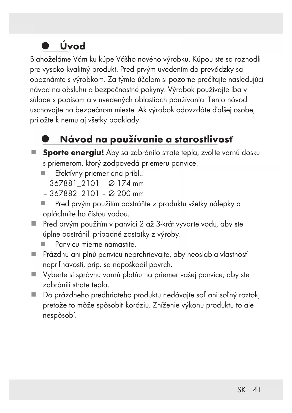 Úvod Blahoželáme Vám ku kúpe Vášho nového výrobku. Kúpou ste sa rozhodli pre vysoko kvalitný produkt. Pred prvým uvedením do prevádzky sa oboznámte s výrobkom. Za týmto účelom si pozorne prečítajte nasledujúci návod na obsluhu a bezpečnostné pokyny. Výrobok používajte iba v súlade s popisom a v uvedených oblastiach používania. Tento návod uschovajte na bezpečnom mieste. Ak výrobok odovzdáte ďalšej osobe, priložte k nemu aj všetky podklady. Návod na používanie a starostlivosť Sporte energiu! Aby sa zabránilo strate tepla, zvoľte varnú dosku s priemerom, ktorý zodpovedá priemeru panvice. Efektívny priemer dna pribl.: – 367881_2101–Ø174mm – 367882_2101–Ø200mm Pred prvým použitím odstráňte z produktu všetky nálepky a opláchnite ho čistou vodou. Pred prvým použitím v panvici 2až3-krát vyvarte vodu, aby ste úplne odstránili prípadné zostatky z výroby. Panvicu mierne namastite. Prázdnu ani plnú panvicu neprehrievajte, aby neoslabla vlastnosť nepriľnavosti, príp. sa nepoškodil povrch. Vyberte si správnu varnú platňu na priemer vašej panvice, aby ste zabránili strate tepla. Do prázdneho predhriateho produktu nedávajte soľ ani soľný roztok, pretože to môže spôsobiť koróziu. Zníženie výkonu produktu to ale nespôsobí.42 SK Nebezpečenstvo prehriatia! Ak sa prehriata panvica bez oleja dostane do kontaktu s potravinami bez tuku, môžu vzniknúť zafarbenia nepriľnavého povrchu spôsobené spálením bielkovín. Tieto sfarbené miesta sa považujú za stopy po používaní a v žiadnom prípade neovplyvňujú kvalitu vrchnej vrstvy a vhodnosť jej používania. Ohrejte jedlo na vysokom/miernom ohni a nechajte ho dôjsť na malom plameni. Nenechávajte panvicu bez dozoru, keď sa ohrieva tuk: Prehriaty tuk sa môže vznietiť. Nikdy nehaste horiaci tuk vodou! Plameň uhaste pokrievkou alebo hrubou vlnenou prikrývkou. Používajte len kuchynské náradie z plastu alebo dreva, aby ste nepoškodili nepriľnavý povrch. Nekrájajte jedlo priamo v panvici. Do panvice nedávajte mokré kvapkajúce mäso. Tuk, ktorý by mohol odfrknúť na žeravú varnú platňu, by mohol spôsobiť požiar. Počas varenia sa môže rozohriať rukoväť. Na ochranu používajte chňapky alebo rukavice na grilovanie. Panvica je vhodná na plynové, elektrické, sklokeramické, indukčné a halogénové varné dosky.43SK Upozornenie pre indukčné dosky: Za istých okolností sa môže vyskytnúť zvuk, ktorý je spôsobený elektromagnetickými vlastnosťami zdroja tepla a produktu. Je to normálne a nepredstavuje to žiadnu poruchu vašej indukčnej varnej dosky alebo nádob na varenie. Produkt treba umiestniť na indukčnú varnú dosku presne do stredu. OPATRNE! Veľmi rýchle ohriatie! Varné nádoby pri predhrievaní neprehrejte. V prípade prehriatia musíte miestnosť dôkladne vyvetrať. Produkt bude fungovať správne, len ak ho vždy umiestnite na varnú dosku, ktorá zodpovedá efektívnemu priemeru dna uvedenému v tomto návode. Vysoké teploty môžu spôsobiť sfarbenie vonkajšej strany produktu. To nie je žiadna materiálová chyba a v žiadnom prípade neovplyvňuje kvalitu alebo funkciu produktu. Horúci produkt nikdy nechlaďte pod studenou tečúcou vodou. Tým by sa mohla spodná strana produktu poškodiť alebo z produktu odpadnúť. Výrobok je vhodný na udržiavanie teplého jedla v rúre. Táto panvica je vhodná do umývačky riadu. Na ručné umývanie použite horúcu vodu a bežný prostriedok na umývanie riadu. Vyhnite sa používaniu ostrých a špicatých predmetov alebo kefiek, aby ste nepoškodili materiál. Pri čistení nepoužívajte žiadne abrazívne prostriedky.44 SK Časté čistenie so silnými čistiacimi prostriedkami môže viesť k poškodeniu a/alebo zafarbeniu panvice. OPATRNE! ŠKRABANCE! Zabráňte šúchaniu produktu po sklokeramickej varnej doske! Predtým, ako začnete s varením, odporúčame vám, aby ste utreli plochu varnej dosky a dno kuchynského riadu čistou handrou bez chlpov (napr.zmikrovlákna). Takto zabránite vzniku škrabancov. Vhodné pre potraviny: Táto panvica nemá žiadnym spôsobom neovplyvňuje chuť a vôňu pripravovaných jedál. Panvicu nikdy nepoužívajte, keď sú uvoľnené rukoväte. V takom prípade skrutky rukovätí utiahnite. Minerály obsiahnuté vo vode môžu časom spôsobiť škvrny alebo zafarbenia na produkte. Môžete ich odstrániť tak, že po nich pošúchate polovičkou citróna. Pretrvávajúce škvrny môžete odstrániť roztokom deviatich dielikov vody a jedného dielika octu. Likvidácia Obal pozostáva z ekologických materiálov, ktoré môžete odovzdať na miestnych recyklačných zberných miestach. O možnostiach likvidácie opotrebovaného výrobku sa môžete informovať na Vašej obecnej alebo mestskej správe.45SK Záruka Tento výrobok bol dôkladne vyrobený podľa prísnych akostných smerníc a pred dodaním svedomito testovaný. V prípade nedostatkov tohto výrobku Vám prináležia zákonné práva voči predajcovi produktu. Tieto zákonné práva nie sú našou nižšie uvedenou zárukou obmedzené. Na tento produkt poskytujeme 3-ročnú záruku od dátumu nákupu. Záručná doba začína plynúť dátumom kúpy. Starostlivo si prosím uschovajte originálny pokladničný lístok. Tento doklad je potrebný ako dôkaz o kúpe. Ak sa v rámci 3 rokov od dátumu nákupu tohto výrobku vyskytne chyba materiálu alebo výrobná chyba, výrobok Vám bezplatne opravíme alebo vymeníme – podľa nášho výberu. Táto záruka zaniká, ak bol produkt poškodený, neodborne používaný alebo neodborne udržiavaný. Poskytnutie záruky sa vzťahuje na chyby materiálu a výrobné chyby. Táto záruka sa nevzťahuje na časti produktu, ktoré sú vystavené normálnemu opotrebovaniu, a preto ich je možné považovať za opotrebovateľné diely (napr. batérie) alebo na poškodenia na rozbitných diel