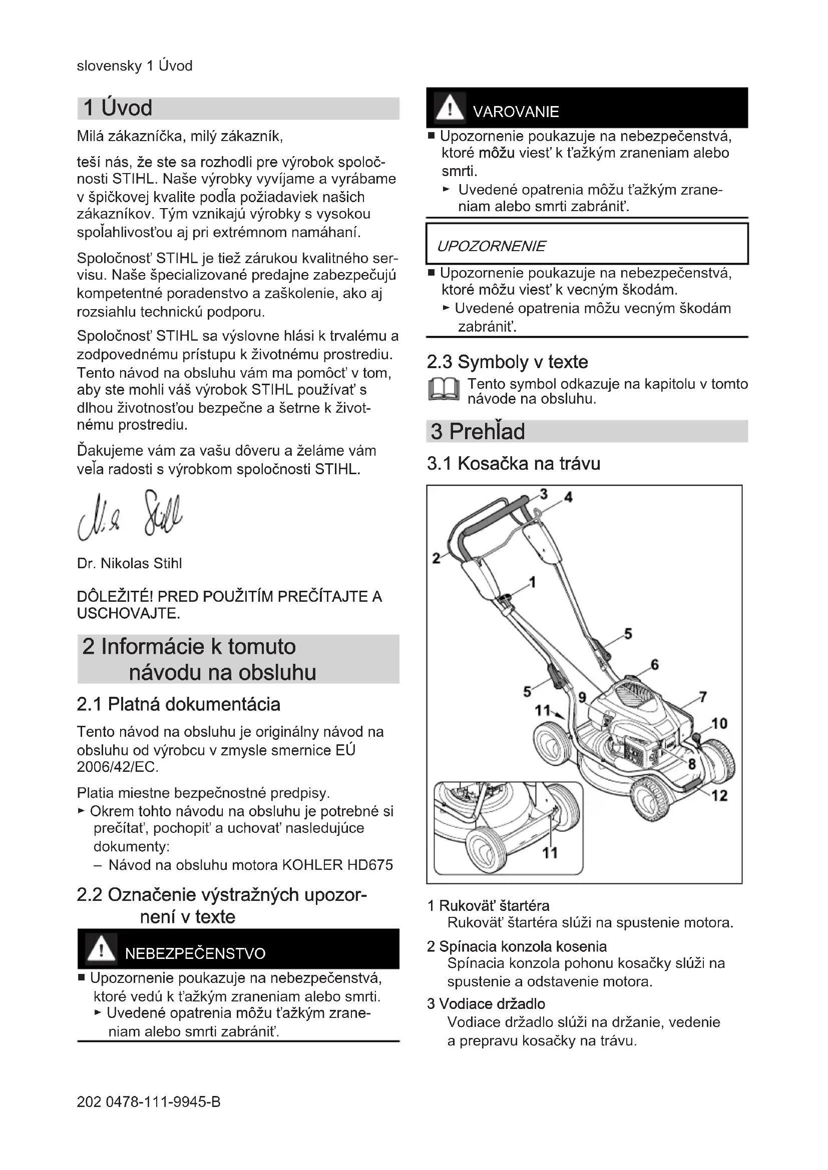 Spolocnost STIHLa sa vyslovne hlasi k trvalemu a zodpovednemu pristupu k zivotnemu prostrediu. Tento navod na obsluhu vam ma pomoct'v tom, aby ste mohl vas vyrobok STIHLa pouzivat's dlhou zivotnostou bezpecne a setrne k zivotnemu prostrediu.