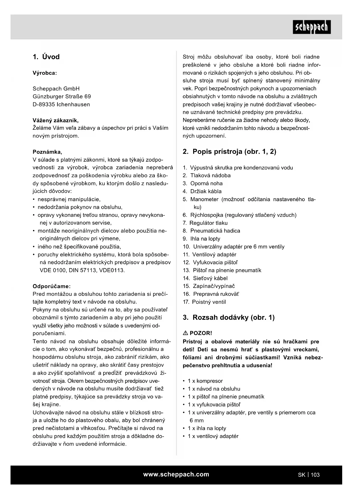 Výrobca: Scheppach GmbH Günzburger Straße 69 D-89335 Ichenhausen Vážený zákazník, Želáme Vám veľa zábavy a úspechov pri práci s Vaším novým prístrojom. Poznámka, V súlade s platnými zákonmi, ktoré sa týkajú zodpo- vednosti za výrobok, výrobca zariadenia nepreberá zodpovednosť za poškodenia výrobku alebo za ško- dy spôsobené výrobkom, ku ktorým došlo z nasledu- júcich dôvodov: