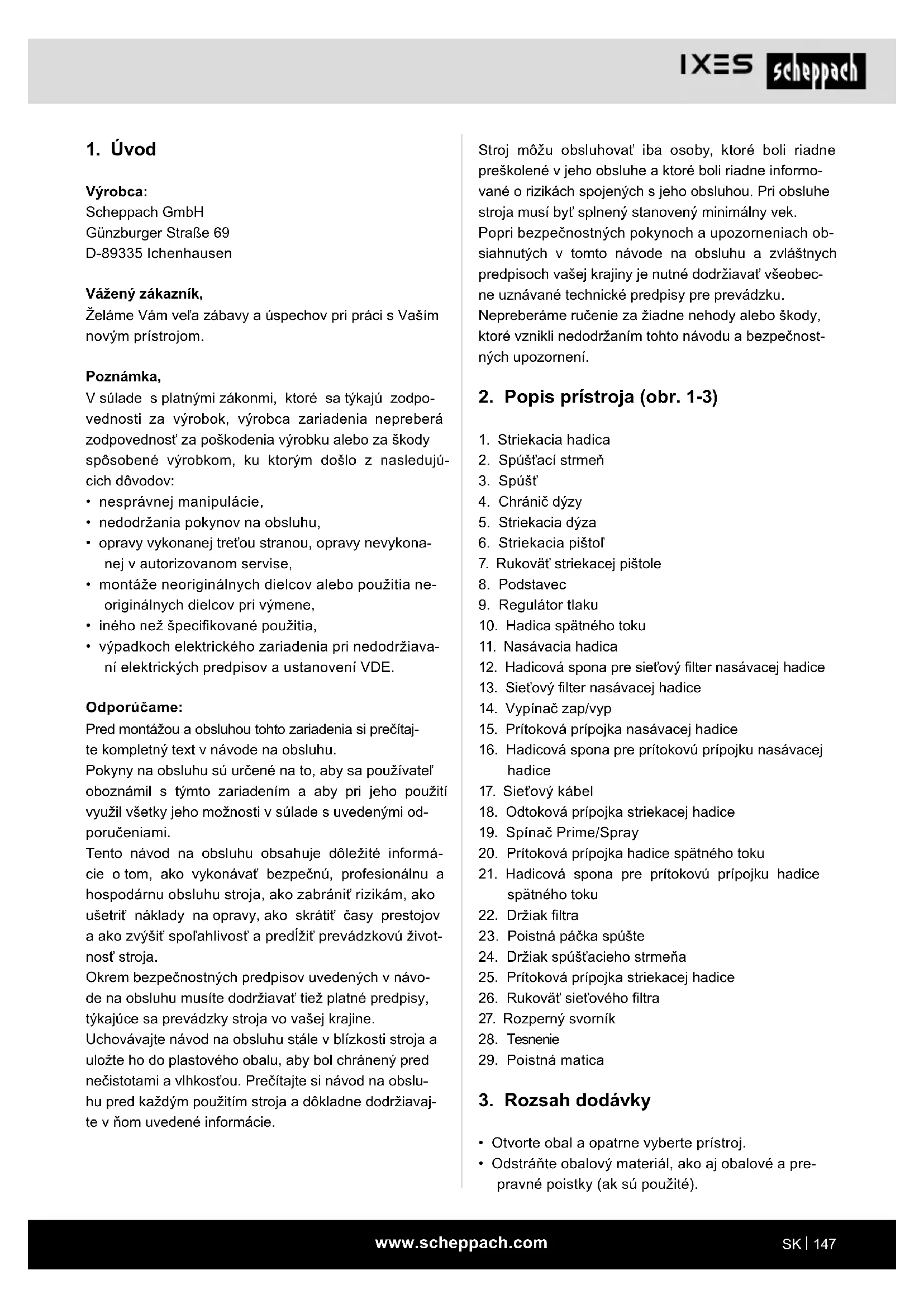 - výpadkoch elektrického zariadenia pri nedodržiava- ní elektrických predpisov a ustanovení VDE. Odporúčame: Pred montážou a obsluhou tohto zariadenia si prečítaj- te kompletný text v návode na obsluhu. Pokyny na obsluhu sú určené na to, aby sa používateľ oboznámil s týmto zariadením a aby pri jeho použití využil všetky jeho možnosti v súlade s uvedenými od- poručeniami. Tento návod na obsluhu obsahuje dôležité informá- cie o tom, ako vykonávať bezpečnú, profesionálnu a hospodárnu obsluhu stroja, ako zabrániť rizikám, ako ušetriť náklady na opravy, ako skrátiť časy prestojov a ako zvýšiť spoľahlivosť a predĺžiť prevádzkovú život- nosť stroja. Okrem bezpečnostných predpisov uvedených v návo- de na obsluhu musíte dodržiavať tiež platné predpisy, týkajúce sa prevádzky stroja vo vašej krajine. Uchovávajte návod na obsluhu stále v blízkosti stroja a uložte ho do plastového obalu, aby bol chránený pred nečistotami a vlhkosťou. Prečítajte si návod na obslu- hu pred každým použitím stroja a dôkladne dodržiavaj- te v ňom uvedené informácie.www.scheppach.com
