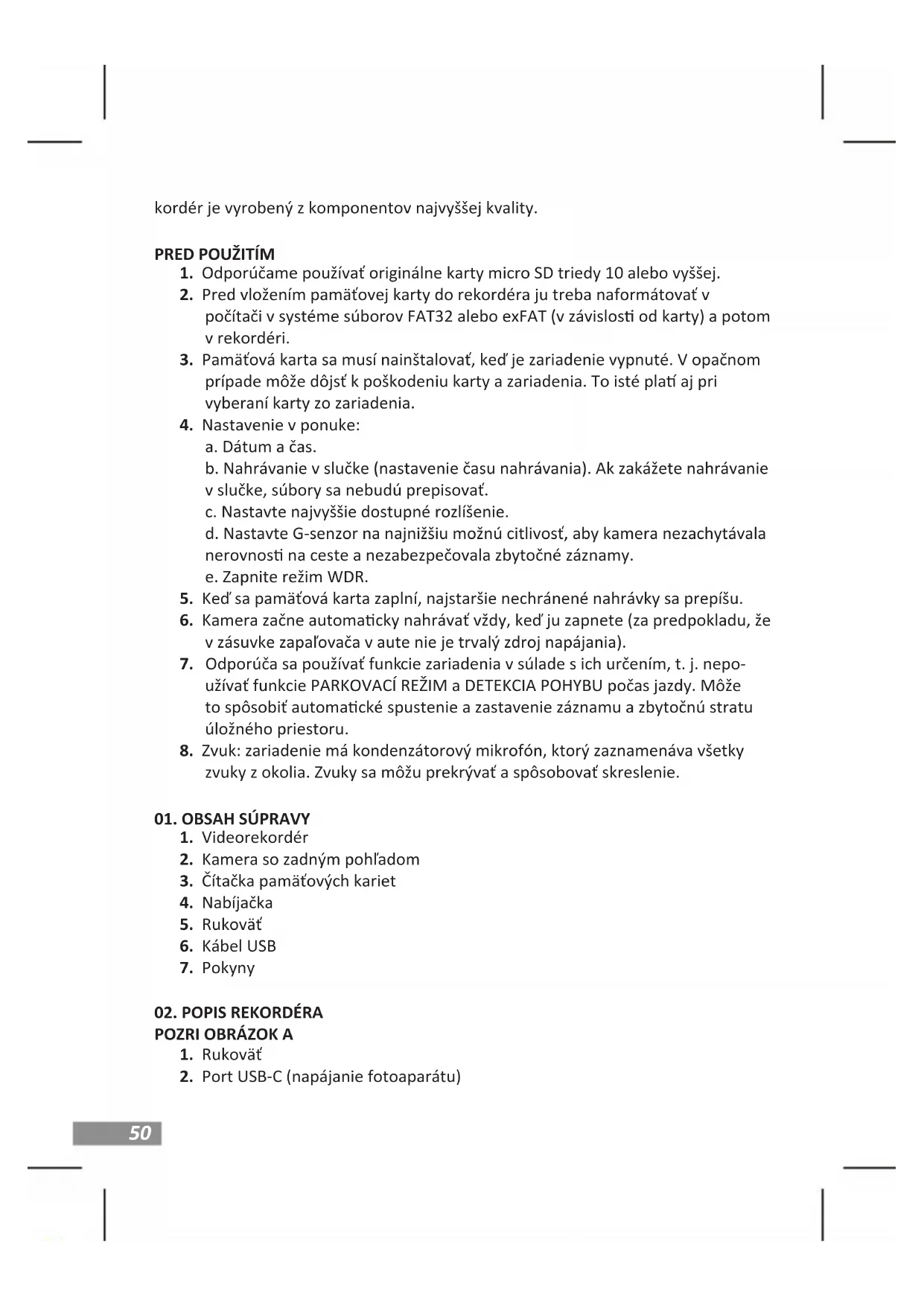 Skontrolujte funkcie „G-senzor” a „parkovací režim” a nastavte ich na minimum. Kartu je potrebné naformátovať v počítači v súborovom systéme FAT32 alebo exFAT (v závislos od karty) a potom v rekordéri. Pozrite si ež: či je kapacita a špecikácia vybranej karty (micro SD, trieda 10 - U1, dodatočne odporúčame V10) vhodná pre vaše zariadenie (odporúčame používať karty od renomovaných výrobcov, odporúčame: Kingston, Samsung, Sandisk). Ak sa v ktorejkoľvek fáze vyskytne chyba, vymeňte kartu za novú od ociál- nych distribútorov.
