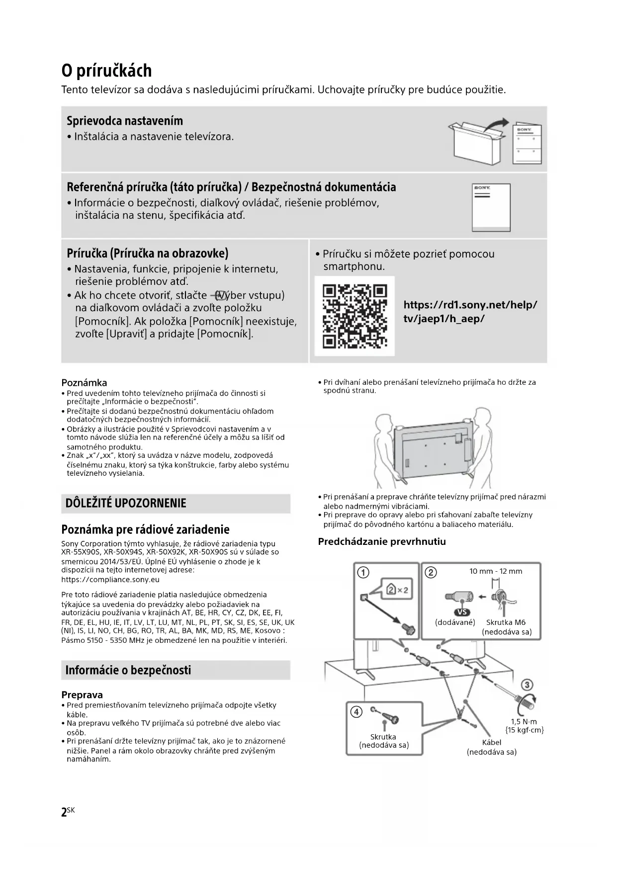 - Pred uvedením tohto televízneho prijímača do činnosti si prečítajte „Informácie o bezpečnosti“.• Prečítajte si dodanú bezpečnostnú dokumentáciu ohľadom dodatočných bezpečnostných informácií. • Obrázky a ilustrácie použité v Sprievodcovi nastavením a v tomto návode slúžia len na referenčné účely a môžu sa líšiť od samotného produktu.• Znak „x“/„xx“, ktorý sa uvádza v názve modelu, zodpovedá číselnému znaku, ktorý sa týka konštrukcie, farby alebo systému televízneho vysielania. Poznámka pre rádiové zariadenie Sony Corporation týmto vyhlasuje, že rádiové zariadenia typu XR-55X90S, XR-50X94S, XR-50X92K, XR-50X90S sú v súlade so smernicou 2014/53/EÚ. Úplné EÚ vyhlásenie o zhode je k dispozícii na tejto internetovej adrese: https://compliance.sony.euPre toto rádiové zariadenie platia nasledujúce obmedzenia týkajúce sa uvedenia do prevádzky alebo požiadaviek na autorizáciu používania v krajinách AT, BE, HR, CY, CZ, DK, EE, FI, FR, DE, EL, HU, IE, IT, LV, LT, LU, MT, NL, PL, PT, SK, SI, ES, SE, UK, UK (NI), IS, LI, NO, CH, BG, RO, TR, AL, BA, MK, MD, RS, ME, Kosovo :Pásmo 5150 - 5350 MHz je obmedzené len na použitie v interiéri. Preprava