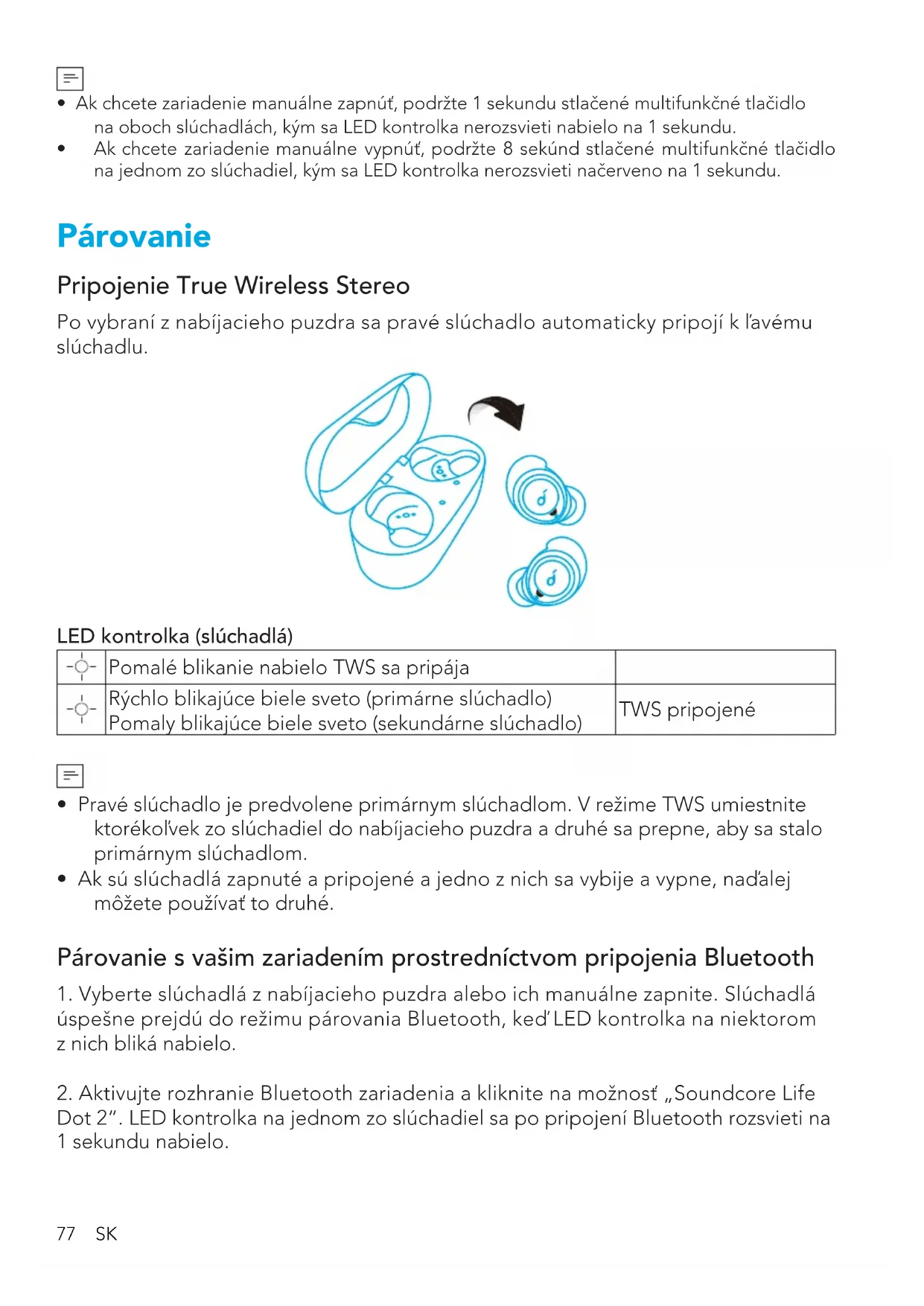 - Ak chcete zariadenie manuálne vypnúť, podržte 8 sekúnd stlačené multifunkčné tlačidlo na jednom zo slúchadiel, kým sa LED kontrolka nerozsvieti načerveno na 1 sekundu. Párovanie Pripojenie True Wireless Stereo Po vybraní z nabíjacieho puzdra sa pravé slúchadlo automaticky pripojí k ľavému slúchadlu. LED kontrolka (slúchadlá) Pomalé blikanie nabielo TWS sa pripája Rýchlo blikajúce biele sveto (primárne slúchadlo) Pomaly blikajúce biele sveto (sekundárne slúchadlo) TWS pripojené