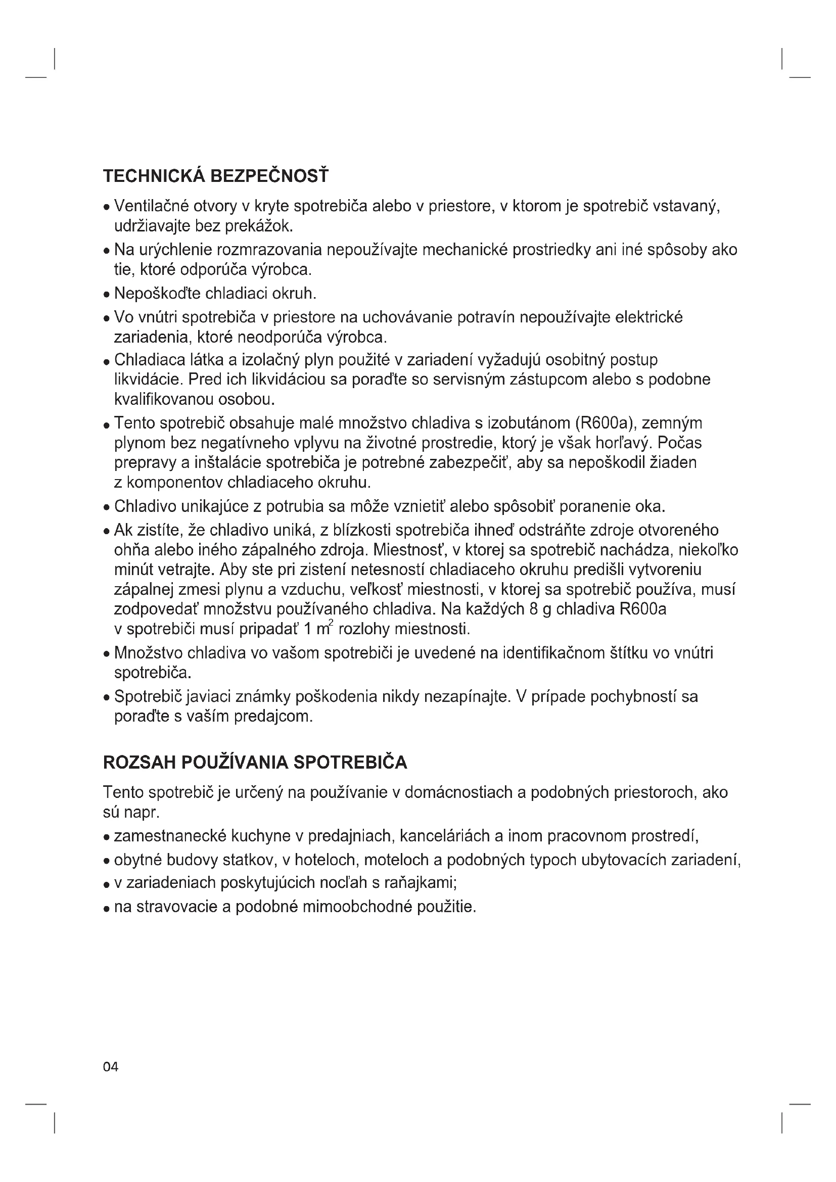 Tento spotrebič obsahuje malé množstvo chladiva s izobutánom (R600a), zemným plynom bez negatívneho vplyvu na životné prostredie, ktorý je však horľavý. Počas prepravy a inštalácie spotrebiča je potrebné zabezpečiť, aby sa nepoškodil žiaden z komponentov chladiaceho okruhu.