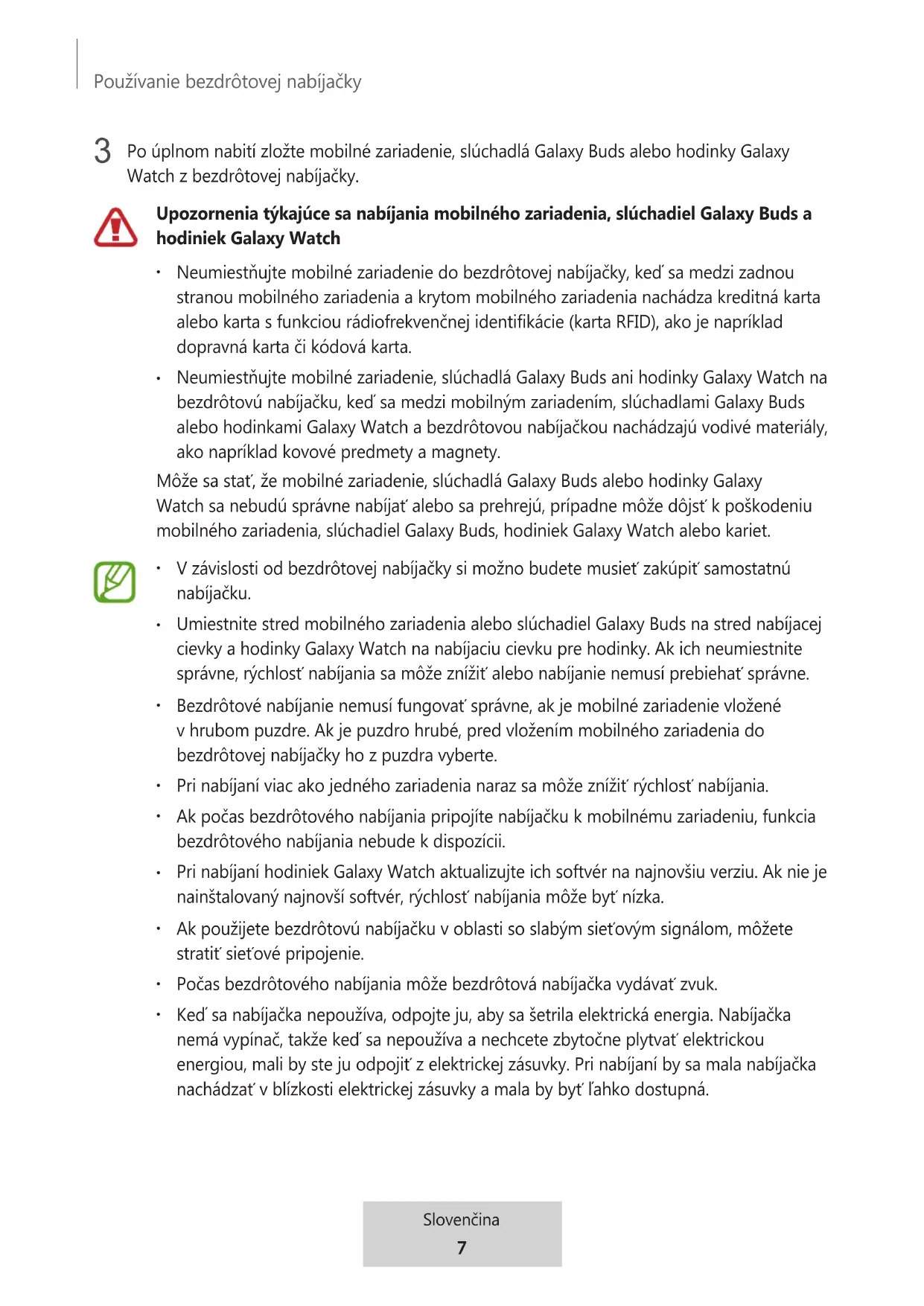 Neumiestňujte mobilné zariadenie, slúchadlá Galaxy Buds ani hodinky Galaxy Watch na bezdrôtovú nabíjačku, keď sa medzi mobilným zariadením, slúchadlami Galaxy Buds alebo hodinkami Galaxy Watch a bezdrôtovou nabíjačkou nachádzajú vodivé materiály, ako napríklad kovové predmety a magnety. Môže sa stať, že mobilné zariadenie, slúchadlá Galaxy Buds alebo hodinky Galaxy Watch sa nebudú správne nabíjať alebo sa prehrejú, prípadne môže dôjsť k poškodeniu mobilného zariadenia, slúchadiel Galaxy Buds, hodiniek Galaxy Watch alebo kariet.