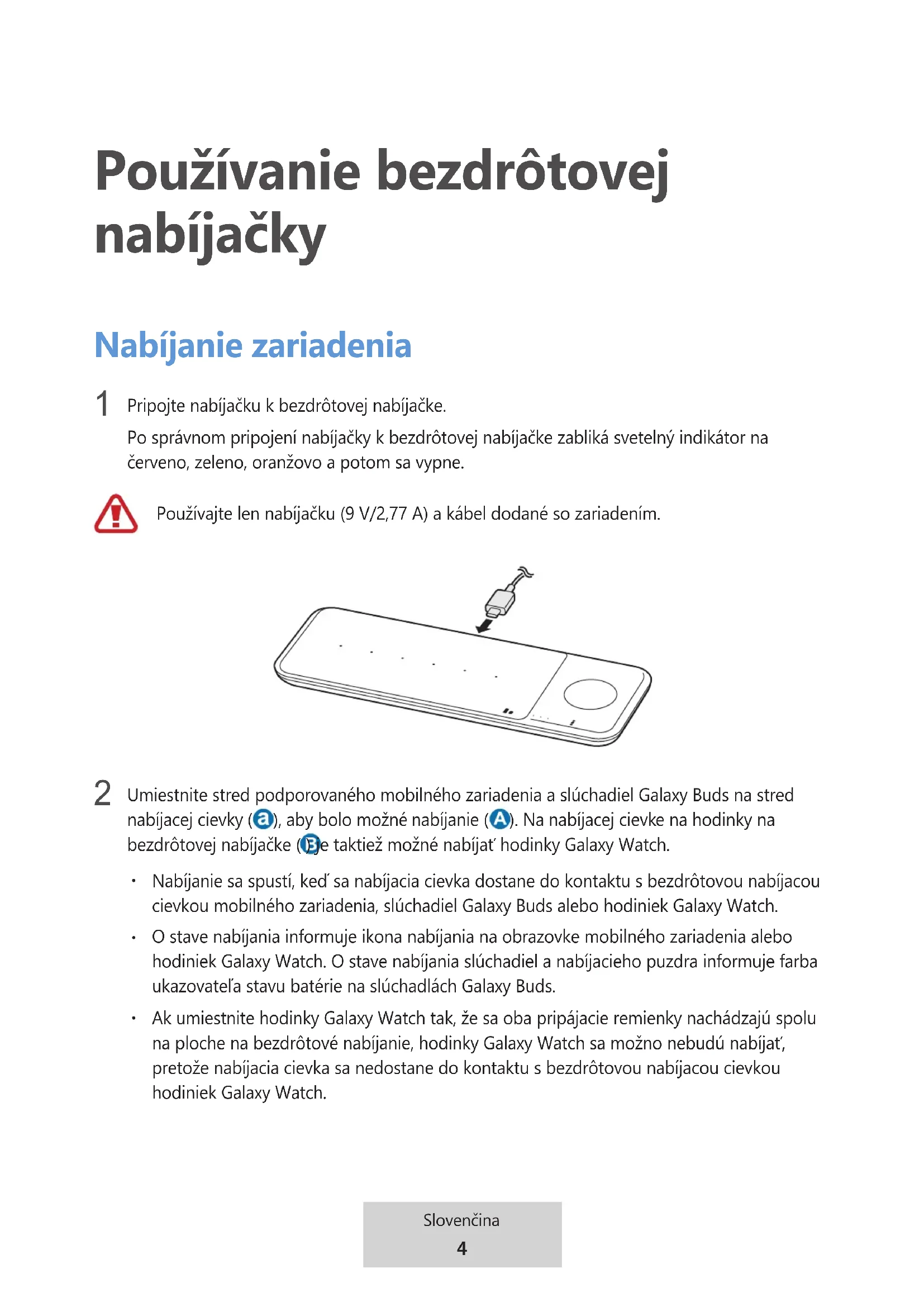 Slovenčina Usporiadanie zariadenia Nabíjací konektor (typ C)Svetelný indikátorPovrch na bezdrôtové nabíjanieStred nabíjacej cievkyNabíjacia cievka pre hodinky Galaxy WatchNabíjacia cievka pre mobilné zariadenia a slúchadlá Galaxy Buds Pomocou bezdrôtovej nabíjačky možno nabíjať až dve zariadenia na nabíjacej cievke pre mobilné zariadenia a slúchadlá Galaxy Buds.4 Slovenčina Používanie bezdrôtovej nabíjačky Nabíjanie zariadenia