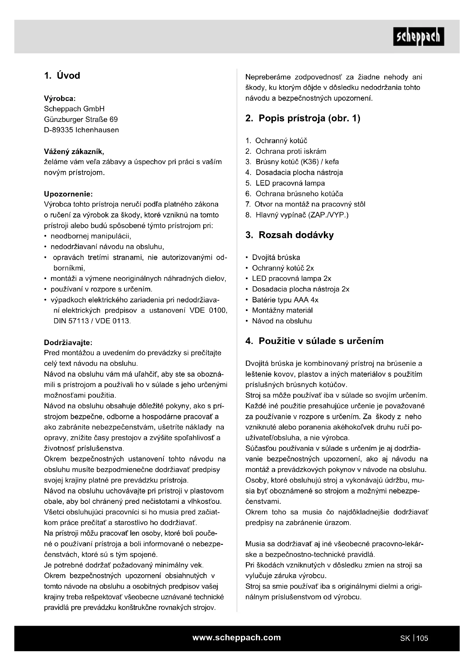Výrobca: Scheppach GmbH Günzburger Straße 69 D-89335 Ichenhausen Vážený zákazník, želáme vám veľa zábavy a úspechov pri práci s vaším novým prístrojom. Upozornenie: Výrobca tohto prístroja neručí podľa platného zákona o ručení za výrobok za škody, ktoré vzniknú na tomto prístroji alebo budú spôsobené týmto prístrojom pri: