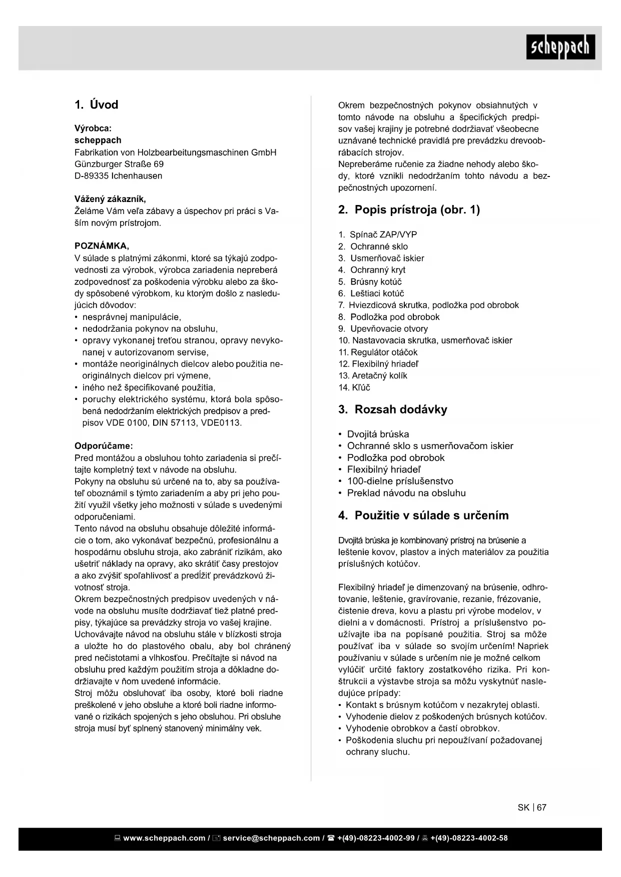 - poruchy elektrického systému, ktorá bola spôso- bená nedodržaním elektrických predpisov a pred- pisov VDE 0100, DIN 57113, VDE0113. Odporúčame: Pred montážou a obsluhou tohto zariadenia si prečí- tajte kompletný text v návode na obsluhu. Pokyny na obsluhu sú určené na to, aby sa používa- teľ oboznámil s týmto zariadením a aby pri jeho pou- žití využil všetky jeho možnosti v súlade s uvedenými odporučeniami. Tento návod na obsluhu obsahuje dôležité informá- cie o tom, ako vykonávať bezpečnú, profesionálnu a hospodárnu obsluhu stroja, ako zabrániť rizikám, ako ušetriť náklady na opravy, ako skrátiť časy prestojov a ako zvýšiť spoľahlivosť a predĺžiť prevádzkovú ži- votnosť stroja. Okrem bezpečnostných predpisov uvedených v ná- vode na obsluhu musíte dodržiavať tiež platné pred- pisy, týkajúce sa prevádzky stroja vo vašej krajine. Uchovávajte návod na obsluhu stále v blízkosti stroja a uložte ho do plastového obalu, aby bol chránený pred nečistotami a vlhkosťou. Prečítajte si návod na obsluhu pred každým použitím stroja a dôkladne do- držiavajte v ňom uvedené informácie. Stroj môžu obsluhovať iba osoby, ktoré boli riadne preškolené v jeho obsluhe a ktoré boli riadne informo- vané o rizikách spojených s jeho obsluhou. Pri obsluhe stroja musí byť splnený stanovený minimálny vek. www.scheppach.com / service@scheppach.com / +(49)-08223-4002-99 / +(49)-08223-4002-58