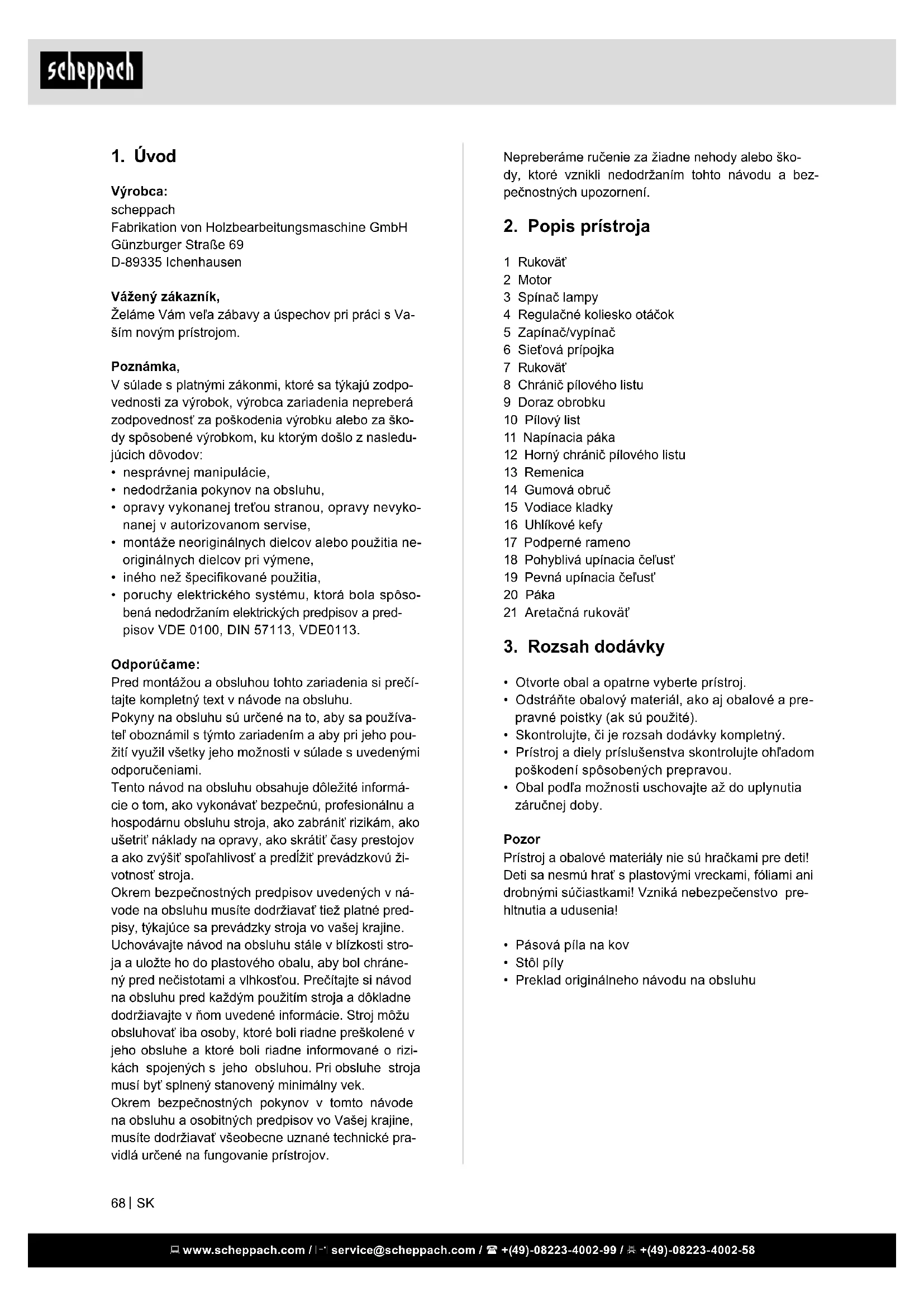 - poruchy elektrického systému, ktorá bola spôso- bená nedodržaním elektrických predpisov a pred- pisov VDE 0100, DIN 57113, VDE0113. Odporúčame: Pred montážou a obsluhou tohto zariadenia si prečí- tajte kompletný text v návode na obsluhu. Pokyny na obsluhu sú určené na to, aby sa používa- teľ oboznámil s týmto zariadením a aby pri jeho pou- žití využil všetky jeho možnosti v súlade s uvedenými odporučeniami. Tento návod na obsluhu obsahuje dôležité informá- cie o tom, ako vykonávať bezpečnú, profesionálnu a hospodárnu obsluhu stroja, ako zabrániť rizikám, ako ušetriť náklady na opravy, ako skrátiť časy prestojov a ako zvýšiť spoľahlivosť a predĺžiť prevádzkovú ži- votnosť stroja. Okrem bezpečnostných predpisov uvedených v ná- vode na obsluhu musíte dodržiavať tiež platné pred- pisy, týkajúce sa prevádzky stroja vo vašej krajine. Uchovávajte návod na obsluhu stále v blízkosti stro- ja a uložte ho do plastového obalu, aby bol chráne- ný pred nečistotami a vlhkosťou. Prečítajte si návod na obsluhu pred každým použitím stroja a dôkladne dodržiavajte v ňom uvedené informácie. Stroj môžu obsluhovať iba osoby, ktoré boli riadne preškolené v jeho obsluhe a ktoré boli riadne informované o rizi- kách spojených s jeho obsluhou. Pri obsluhe stroja musí byť splnený stanovený minimálny vek. Okrem bezpečnostných pokynov v tomto návode na obsluhu a osobitných predpisov vo Vašej krajine, musíte dodržiavať všeobecne uznané technické pra- vidlá určené na fungovanie prístrojov. www.scheppach.com / service@scheppach.com / +(49)-08223-4002-99 / +(49)-08223-4002-58