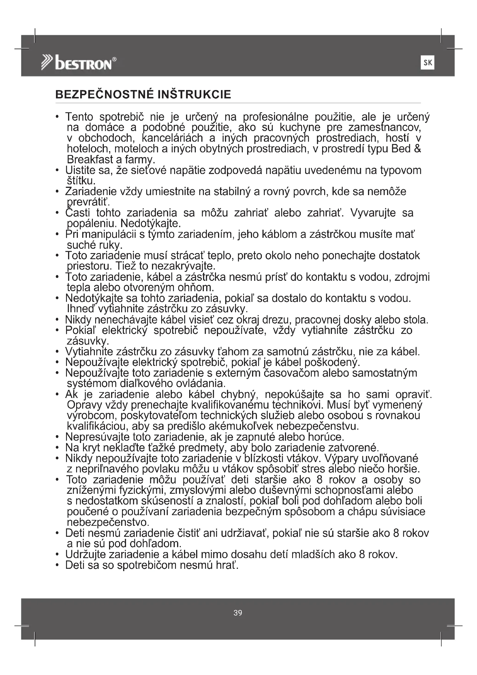 - Toto zariadenie môžu používať deti staršie ako 8 rokov a osoby so zníženými fyzickými, zmyslovými alebo duševnými schopnosťami alebo s nedostatkom skúseností a znalostí, pokiaľ boli pod dohľadom alebo boli poučené o používaní zariadenia bezpečným spôsobom a chápu súvisiace nebezpečenstvo.