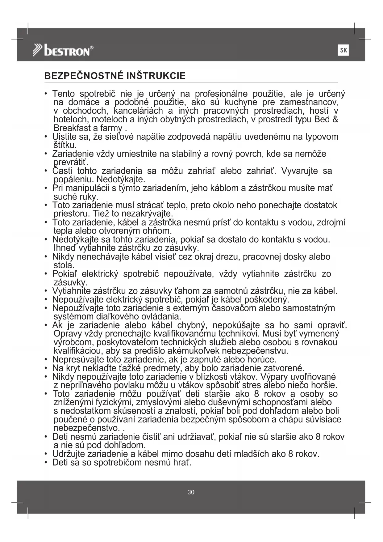 - Vaša obec vám môže oznámiť, kde vo vašej oblasti nájdete určené zberné miesto odpadu. PRÁCA V nepravdepodobnom prípade poruchy kontaktujte zákaznícky servis Bestron: www.bestron.com/service Technické špecifikácie Modelka APZ400 Napájanie (V) 220-240V~ Frekvencia (Hz) 50/60 Bezpečnostná trieda 1 Výkon (W) 1800 Hlučnosť (dB(A)) - Maximálna kapacita - Maximálna doba nepretržitého vykonávania KB - Rozmery (D x Š x V) (cm) 37,5x31x16 Dĺžka kábla (cm) 70SK