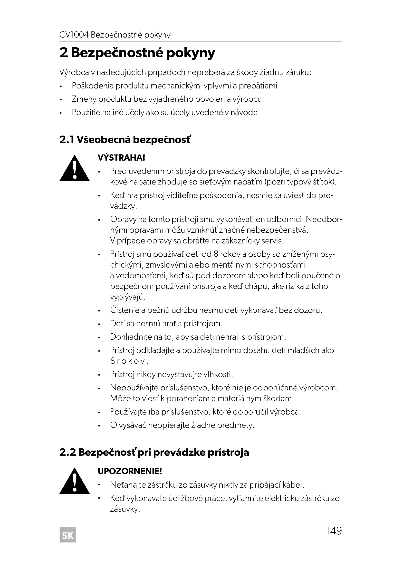 2 Bezpečnostné pokyny Výrobca v nasledujúcich prípadoch nepreberá za škody žiadnu záruku: