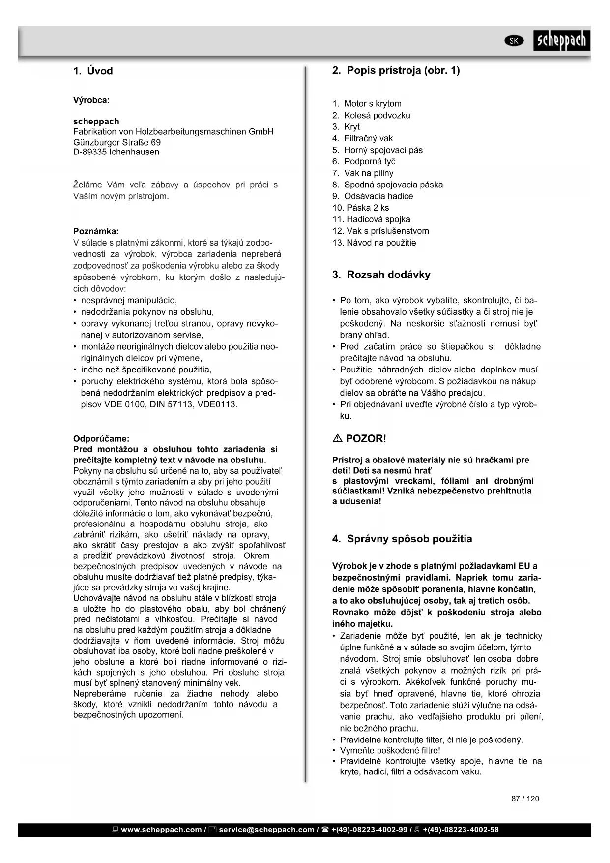 Pokyny na obshluu su urcené na to, aby sa použivatel oboznámil s tymto zariadenim a aby pri jeho pouziti vyuzil vsetky jeho moznosti v sulade s uvedenymi odporuceniami. Tento navod na obshluu obsahuje dolezite informácie o tom, ako vykonávat bezpečnú, professionálnu a hospodárnnu obshluu stroja, ako zabránit rizikám, ako ušetrit náklyne na opravy, ako skratit casy prestojov a ako zvysit spo'ahlivost a predlžit prevadzkovuŽivotnost'stroja. Okrem bezpečnostnych predpisov uveden'ych v navode na obshluu musité dorziavat tiež platné predpisy, týka-juce sa prevadzky stroja vo vašej krajine.