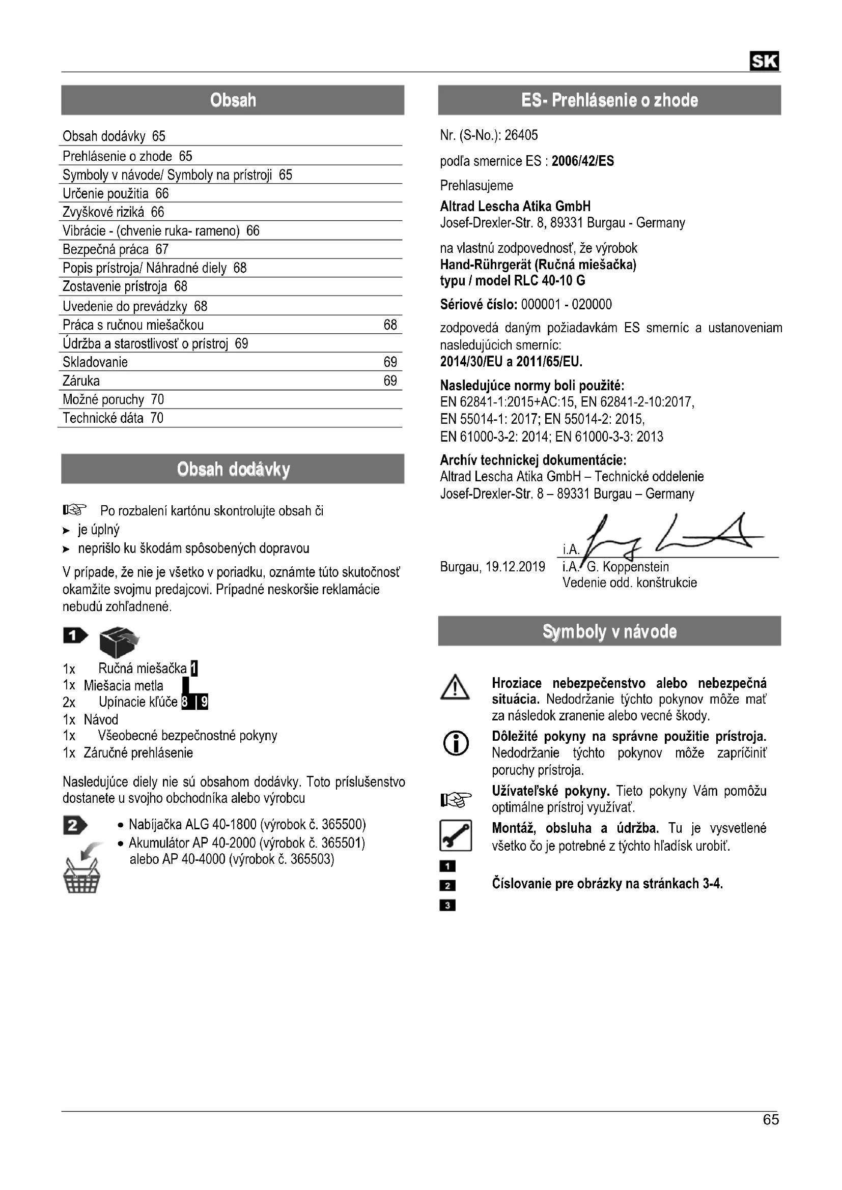 Nr. (S-No.): 26405 podľa smernice ES : 2006/42/ES Prehlasujeme Altrad Lescha Atika GmbH Josef-Drexler-Str. 8, 89331 Burgau - Germany na vlastnú zodpovednosť, že výrobok Hand-Rührgerät (Ručná miešačka) typu / model RLC 40-10 G Sériové číslo: 000001 - 020000 zodpovedá daným požiadavkám ES smerníc a ustanoveniam nasledujúcich smerníc: 2014/30/EU a 2011/65/EU. Nasledujúce normy boli použité: EN 62841-1:2015+AC:15, EN 62841-2-10:2017, EN 55014-1: 2017; EN 55014-2: 2015, EN 61000-3-2: 2014; EN 61000-3-3: 2013 Archív technickej dokumentácie: Altrad Lescha Atika GmbH – Technické oddelenie Josef-Drexler-Str. 8 – 89331 Burgau – Germany