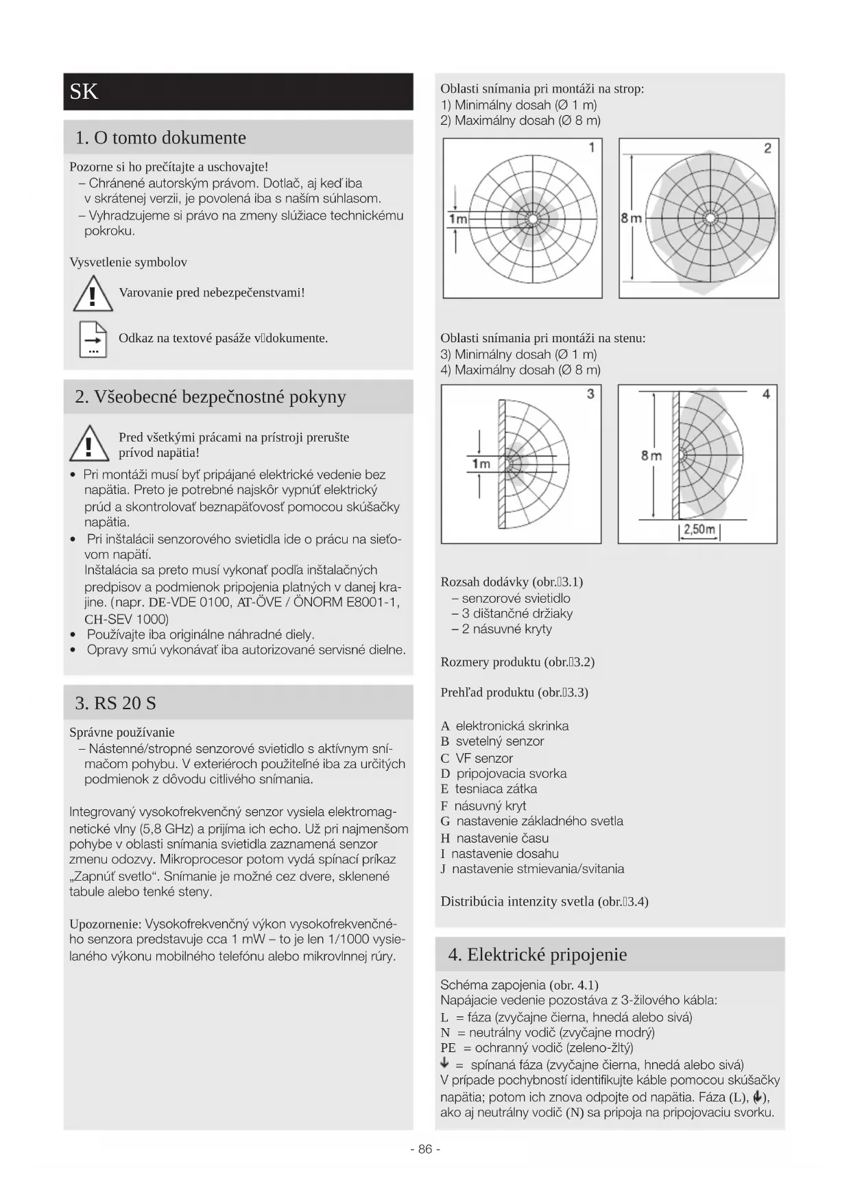 Správne používanie – Nástenné/stropné senzorové svietidlo saktívnym sní-mačom pohybu. Vexteriéroch použiteľné iba za určitých podmienok zdôvodu citlivého snímania.Integrovaný vysokofrekvenčný senzor vysiela elektromag-netické vlny (5,8GHz) a prijíma ich echo. Už pri najmenšom pohybe v oblasti snímania svietidla zaznamená senzor zmenu odozvy. Mikroprocesor potom vydá spínací príkaz „Zapnúť svetlo“. Snímanie je možné cez dvere, sklenené tabule alebo tenké steny.Upozornenie: Vysokofrekvenčný výkon vysokofrekvenčné-ho senzora predstavuje cca1mW – to je len 1/1000vysie-laného výkonu mobilného telefónu alebo mikrovlnnej rúry. !- 87 - Dôležité: Zámena vodičov neskôr vedie kskratu vprístroji alebo vskrinke spoistkami. Vtomto prípade jednotlivé káble ešte raz identifikujte a nanovo zapojte. Na sieťové vedenie sa môže nainštalovať sieťový spínač na zapínanie a vy pínanie (pri použití bez modulu núdzového svetla). Pripojenie na stmievač vedie kpoškodeniu senzorového svietidla. Upozornenie: Nedotýkajte sa priamo LED diódy. Poznámka: Svetelný zdroj tohto svietidla sa nedá nahradiť. Vprípade nutnosti výmeny svetelného zdroja (napr. na konci jeho životnosti) sa musí vymeniť celé svietidlo.