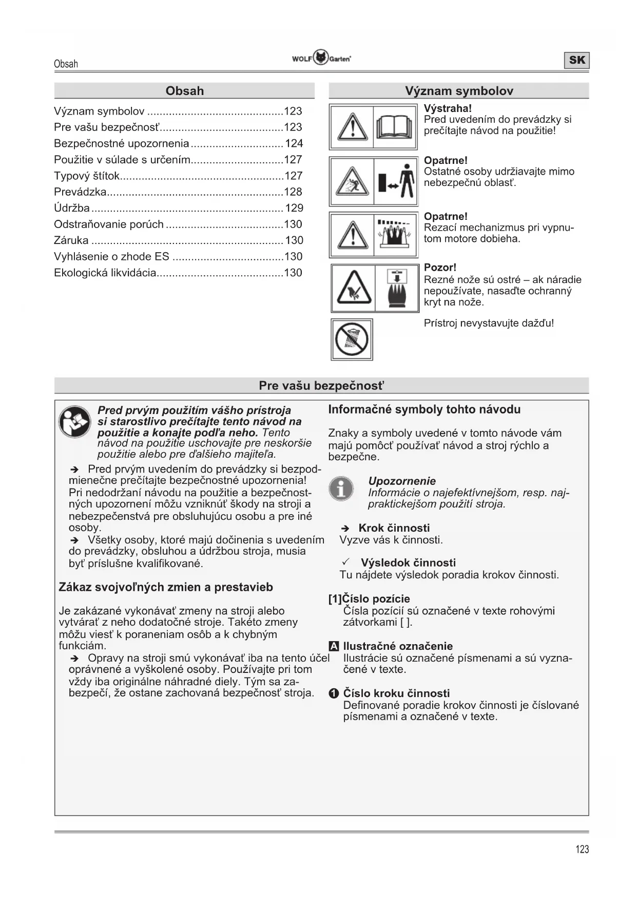 Bezpečnostné upozornenia Stupne nebezpečenstiev výstražných upozor- není V tomto návode na použitie sa používajú nasledu- júce stupne nebezpečenstiev, aby sa upozornilo na potenciálne nebezpečné situácie: NEBEZPEČENSTVO ! Bezprostredne hrozí nebezpečná situácia a táto vedie, ak sa nedodržia opatrenia, k ťažkým poraneniam alebo až k smrti. VÝSTRAHA ! Môže sa vyskytnúť nebezpečná situácia a táto vedie, ak sa nedodržia opatrenia, k ťažkým poraneniam alebo až k smrti. OPATRNE ! Môže sa vyskytnúť nebezpečná situácia a táto vedie, ak sa nedodržia opatrenia, k ľahkým alebo k nepatrným poraneniam. Pozor ! Môže sa vyskytnúť pravdepodobne škodlivá situácia a táto vedie, ak sa jej nezabráni, k vecným škodám. Štruktúra bezpečnostných upozornení NEBEZPEČENSTVO ! Druh a zdroj nebezpečenstva! ÂNásledky pri nedodržaní ¾ Opatrenia na odvrátenie nebezpečenstva Bezpečnosť na pracovisku ¾ Pracovnú oblasť udržiavajte čistú a dobre osvetlenú. Neporiadok alebo neosvetlené pracovné oblasti môžu viesť k nehodám. ¾ S elektrickým náradím nepracujte v prostredí ohrozenom výbuchom, v ktorom sa nachádzajú horľavé kvapaliny, plyny alebo prachy. Elektrické náradie môže vytvárať iskry, ktoré môžu zapáliť prach alebo výpary. ¾ Počas používania elektrického náradia udržujte deti a ostatné osoby mimo pracovnej oblasti. Pri odchýlení môžete stratiť kontrolu nad prístrojom. Elektrická bezpečnosť ¾ Ihneď vytiahnite sieťovú zástrčku, keď bolo vedenie poškodené alebo pretnuté. ¾ Prípojná zástrčka elektrického náradia sa musí hodiť do zásuvky. Zástrčka sa nesmie žiadnym spôsobom meniť. Nepoužívajte adaptérovú zástrčku spolu s ochranne uzemnenými elektrickými náradiami. Nezmenené zástrčky a vhodné zásuvky znižujú riziko zásahu elektrickým prúdom. ¾ Zabráňte kontaktu tela s uzemnenými plochami, ako rúry, kúrenia, sporák a chladničky. Hrozí zvýšené riziko zásahom elektrickým prúdom, keď je Vaše telo uzemnené. ¾ Elektrické náradie udržiavajte mimo dažďa alebo mokra. Vniknutie vody do elektrického náradia zvyšuje riziko zásahu elektrickým prúdom. ¾ Kábel nepoužívajte na iné účely, na nosenie elektrického náradia, na zavesenie ani na vytiahnutie zástrčky zo zásuvky. Kábel udržiavajte vzdialený od tepla, oleja, ostrých hrán alebo pohybujúcich sa dielov prístroja. Poškodené alebo zamotané káble zvyšujú riziko zásahu elektrickým prúdom. ¾ Nabíjajte iba akumulátory Wolf-Garten. Napätie akumulátora sa musí prispôsobiť nabíjaciemu napätiu nabíjačky. Inak hrozí nebezpečenstvo požiaru a výbuchu. ¾ Prístroj udržiavajte čistý. V dôsledku znečistení hrozí nebezpečenstvo zásahu elektrickým prúdom. Bezpečnosť osôb ¾ Tento prístroj nesmú používať osoby s obmedzenými fyzickými, senzorickými alebo duševnými schopnosťami alebo s nedostatočnými skúsenosťami a vedomosťami, ani keď sú pod dozorom alebo boli zaučené ohľadom bezpečného používania prístroja a rozumejú nebezpečenstvám, ktoré z použitia vyplývajú. ¾ Deti sa s prístrojom nesmú hrať. ¾ Čistenie a údržbu prostredníctvom používateľa nesmú vykonávať deti. ¾ Prístroj nepoužívajte s chybnými alebo nenamontovanými bezpečnostnými zariadeniami.Bezpečnostné upozornenia