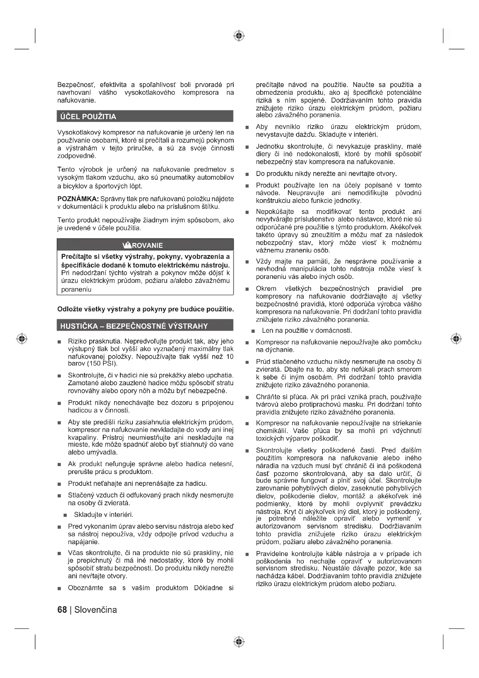 Vysokotlakový kompresor na nafukovanie je určený len na používanie osobami, ktoré si prečítali a rozumejú pokynom a výstrahám v tejto príručke, a sú za svoje činnosti zodpovedné. Tento výrobok je určený na nafukovanie predmetov s vysokým tlakom vzduchu, ako sú pneumatiky automobilov a bicyklov a športových lôpt. POZNÁMKA: Správny tlak pre nafukovanú položku nájdete v dokumentácii k produktu alebo na príslušnom štítku. Tento produkt nepoužívajte žiadnym iným spôsobom, ako je uvedené v účele použitia. VAROVANIE Prečítajte si všetky výstrahy, pokyny, vyobrazenia a špecifikácie dodané k tomuto elektrickému nástroju. Pri nedodržaní týchto výstrah a pokynov môže dôjsť k úrazu elektrickým prúdom, požiaru a/alebo závažnému poraneniu Odložte všetky výstrahy a pokyny pre budúce použitie.