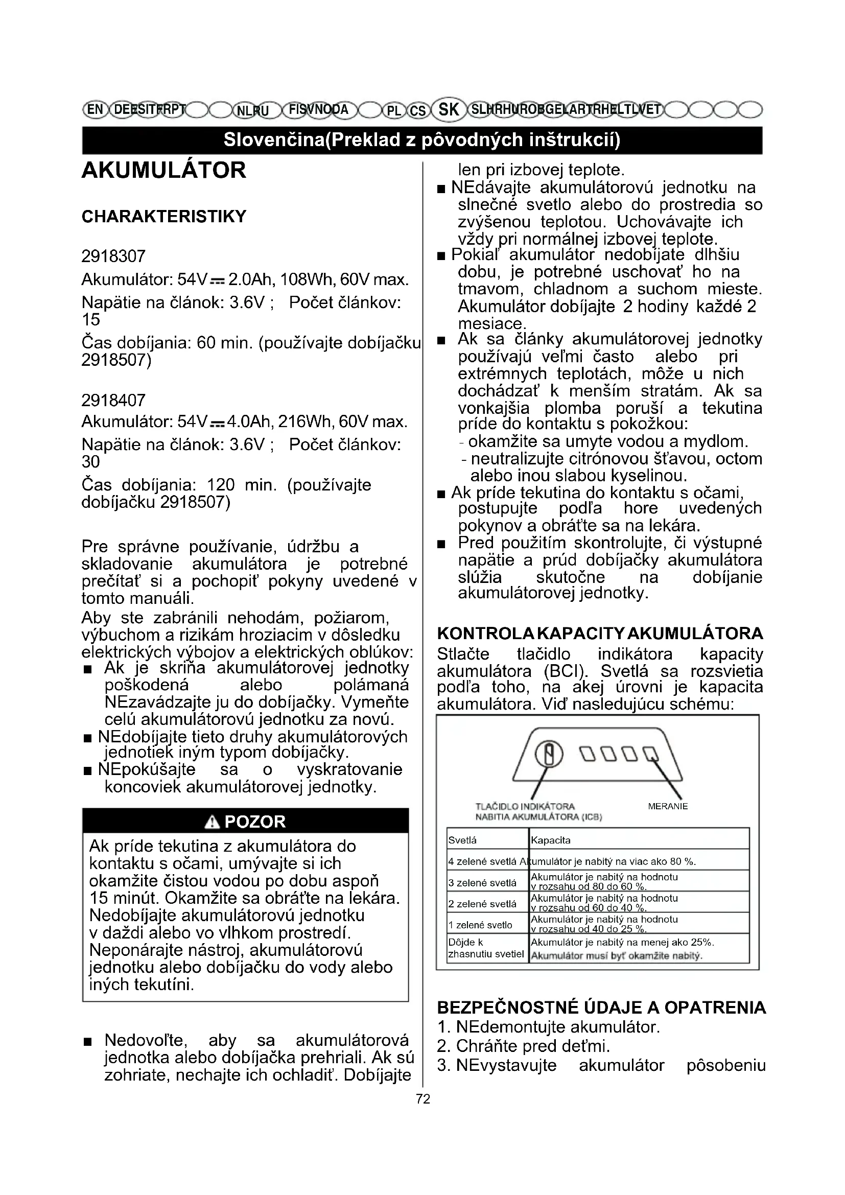Čas dobíjania: 120 min. (používajte dobíjačku 2918507) Pre správne používanie, údržbu a skladovanie akumulátora je potrebné prečítať si a pochopiť pokyny uvedené v tomto manuáli. Aby ste zabránili nehodám, požiarom, výbuchom a rizikám hroziacim v dôsledku elektrických výbojov a elektrických oblúkov: ■ Ak je skriňa akumulátorovej jednotky poškodená alebo polámaná NEzavádzajte ju do dobíjačky. Vymeňte celú akumulátorovú jednotku za novú. ■ NEdobíjajte tieto druhy akumulátorových jednotiek iným typom dobíjačky. ■ NEpokúšajte sa o vyskratovanie koncoviek akumulátorovej jednotky. POZOR Ak príde tekutina z akumulátora do kontaktu s očami, umývajte si ich okamžite čistou vodou po dobu aspoň 15 minút. Okamžite sa obráťte na lekára. Nedobíjajte akumulátorovú jednotku v daždi alebo vo vlhkom prostredí. Neponárajte nástroj, akumulátorovú jednotku alebo dobíjačku do vody alebo iných tekutíni. ■ Nedovoľte, aby sa akumulátorová jednotka alebo dobíjačka prehriali. Ak sú zohriate, nechajte ich ochladiť. Dobíjajte len pri izbovej teplote. ■ NEdávajte akumulátorovú jednotku na slnečné svetlo alebo do prostredia so zvýšenou teplotou. Uchovávajte ich vždy pri normálnej izbovej teplote. ■ Pokiaľ akumulátor nedobíjate dlhšiu dobu, je potrebné uschovať ho na tmavom, chladnom a suchom mieste. Akumulátor dobíjajte 2 hodiny každé 2 mesiace. ■ Ak sa články akumulátorovej jednotky používajú veľmi často alebo pri extrémnych teplotách, môže u nich dochádzať k menším stratám. Ak sa vonkajšia plomba poruší a tekutina príde do kontaktu s pokožkou: - okamžite sa umyte vodou a mydlom. - neutralizujte citrónovou šťavou, octom alebo inou slabou kyselinou. ■ Ak príde tekutina do kontaktu s očami, postupujte podľa hore uvedených pokynov a obráťte sa na lekára. ■ Pred použitím skontrolujte, či výstupné napätie a prúd dobíjačky akumulátora slúžia skutočne na dobíjanie akumulátorovej jednotky.
