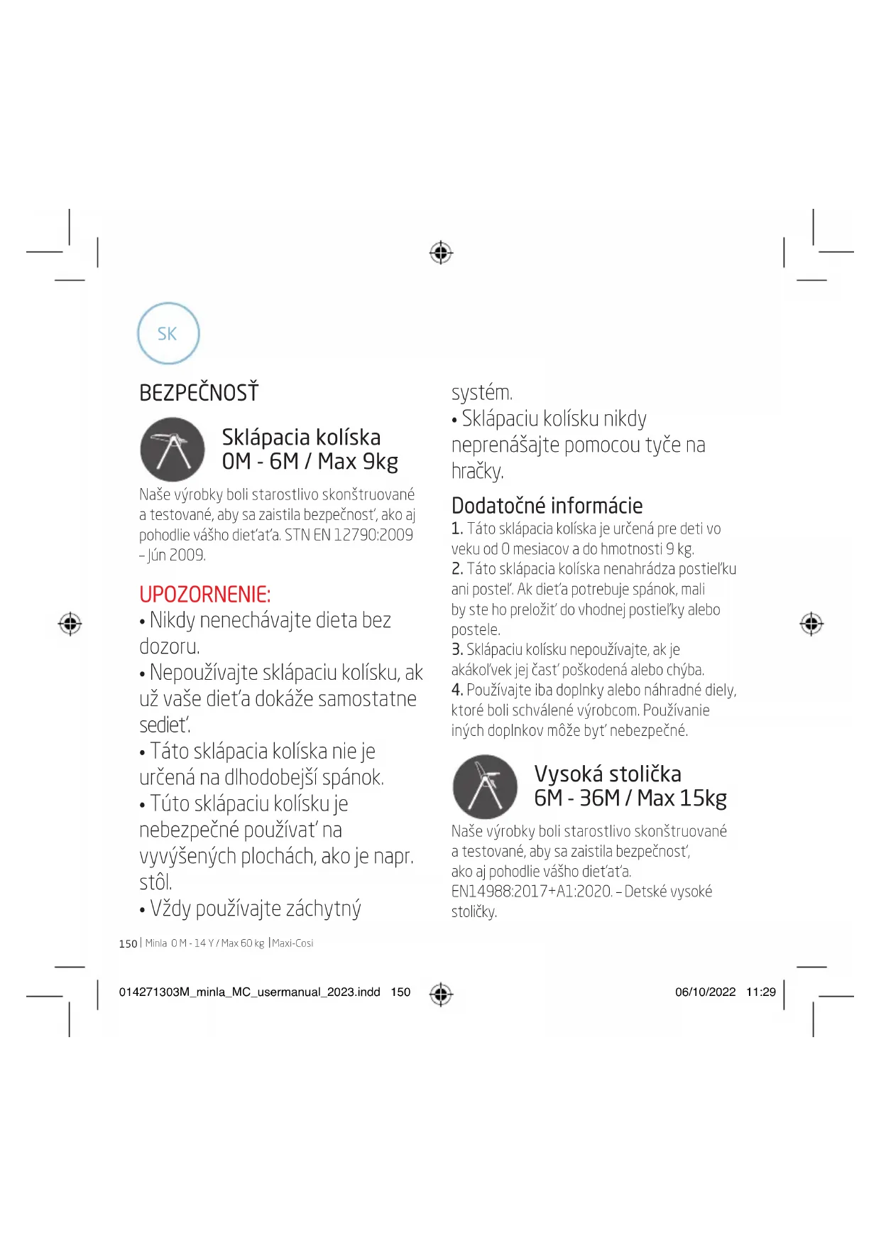 ktoré boli schválené výrobcom. Používanie iných doplnkov môže byť nebezpečné. Vysoká stolička 6M - 36M / Max 15kg Naše výrobky boli starostlivo skonštruované a testované, aby sa zaistila bezpečnosť, ako aj pohodlie vášho dieťaťa. EN14988:2017+A1:2020. – Detské vysoké stoličky. 014271303M_minla_MC_usermanual_2023.indd 150014271303M_minla_MC_usermanual_2023.indd 150 06/10/2022 11:2906/10/2022 11:29Maxi-Cosi