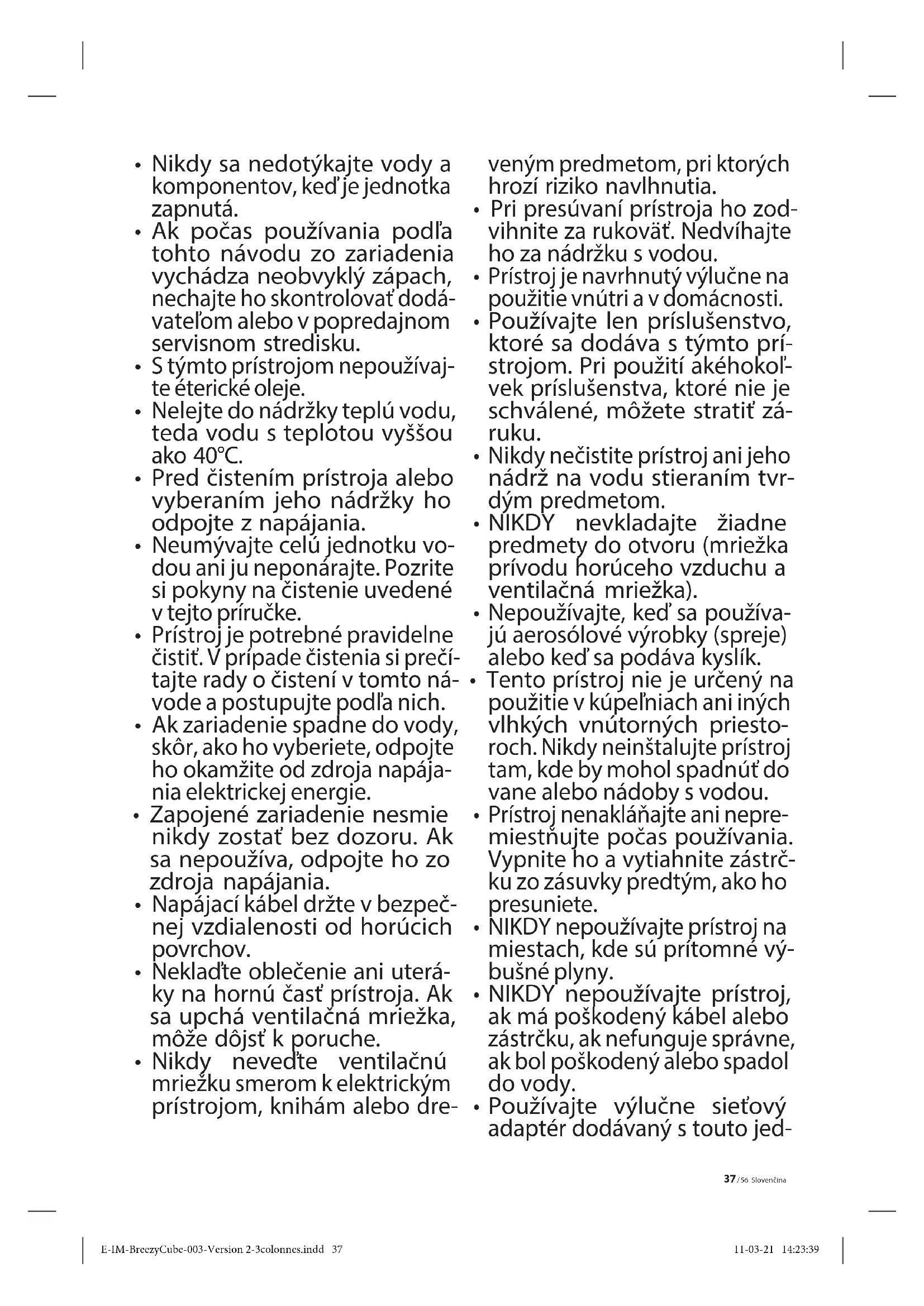 Používajte výlučne sieťový adaptér dodávaný s touto jed- E-IM-BreezyCube-003-Version 2-3colonnes.indd 37E-IM-BreezyCube-003-Version 2-3colonnes.indd 37 11-03-21 14:23:3911-03-21 14:23:39Slovenčina 38 / 56 notkou. Dodaný adaptér by sa mal používať iba s prí- strojom a nie na iné účely.