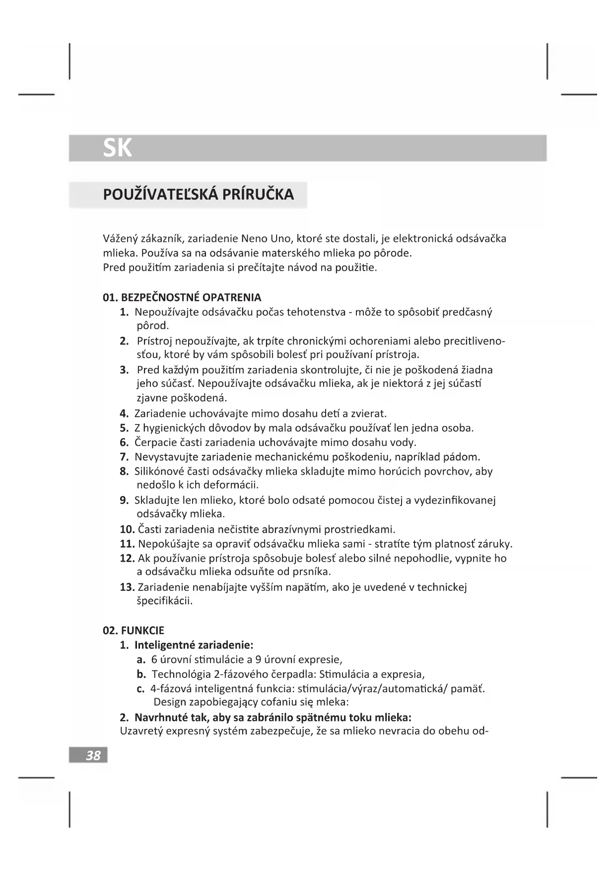 Vážený zákazník, zariadenie Neno Uno, ktoré ste dostali, je elektronická odsávačka mlieka. Používa sa na odsávanie materského mlieka po pôrode. Pred použim zariadenia si prečítajte návod na použie.
