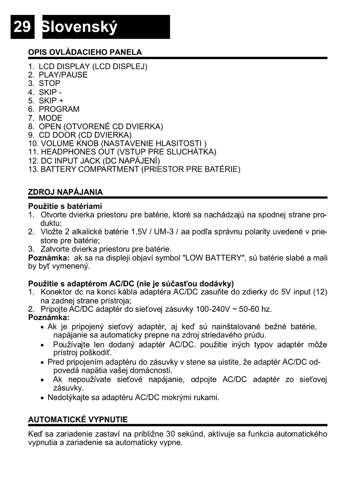 Poznámka: ak sa na displeji objaví symbol "LOW BATTERY", sú batérie slabé a mali by byť vymenený. Použitie s adaptérom AC/DC (nie je súčasťou dodávky)