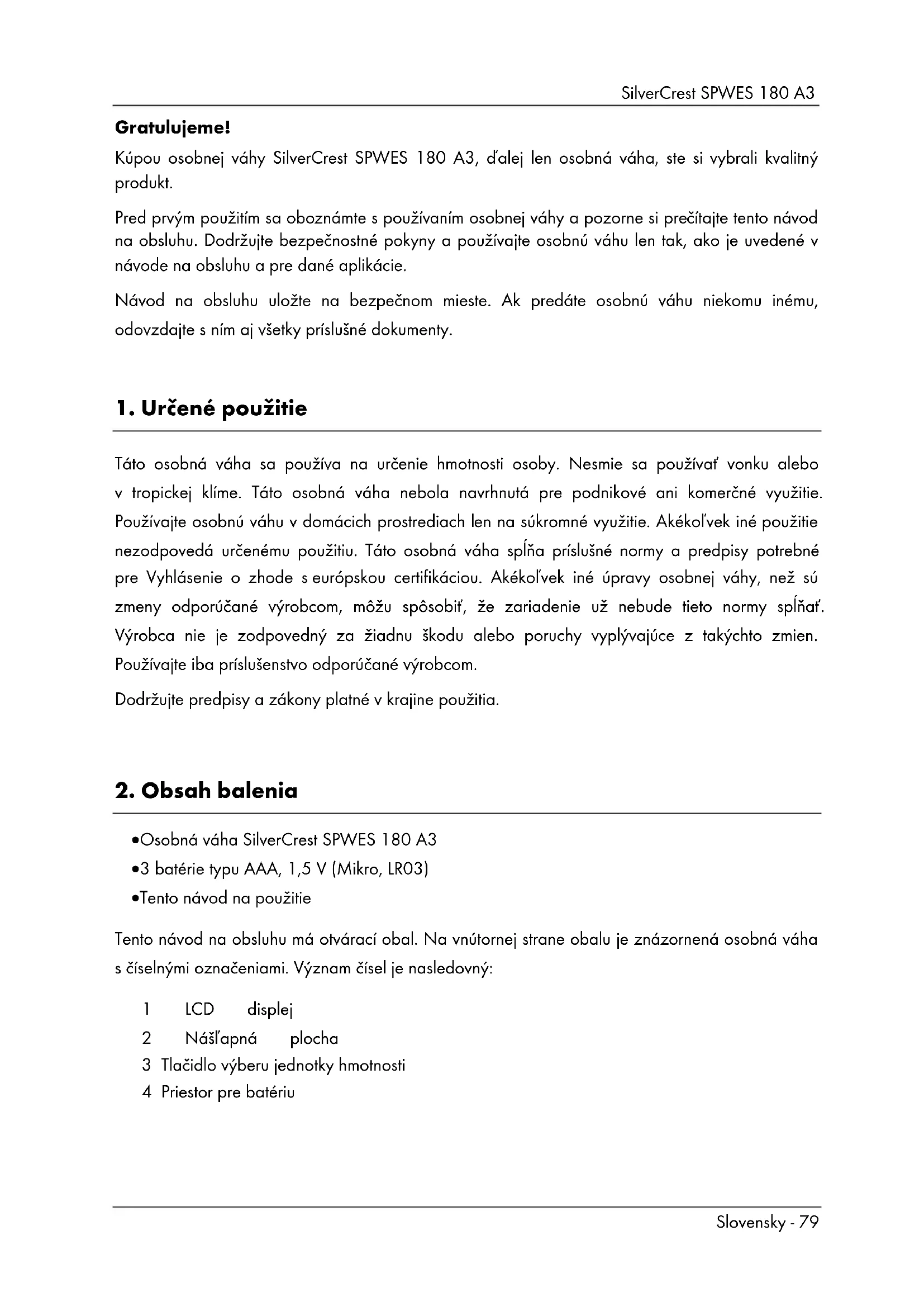 12. Informácie o záruke a servise ..................................................................... 88SilverCrest SPWES 180 A3 Slovensky - 79 Gratulujeme! Kúpou osobnej váhy SilverCrest SPWES 180 A3, ďalej len osobná váha, ste si vybrali kvalitný produkt. Pred prvým použitím sa oboznámte s používaním osobnej váhy a pozorne si prečítajte tento návod na obsluhu. Dodržujte bezpečnostné pokyny a používajte osobnú váhu len tak, ako je uvedené v návode na obsluhu a pre dané aplikácie. Návod na obsluhu uložte na bezpečnom mieste. Ak predáte osobnú váhu niekomu inému, odovzdajte s ním aj všetky príslušné dokumenty.