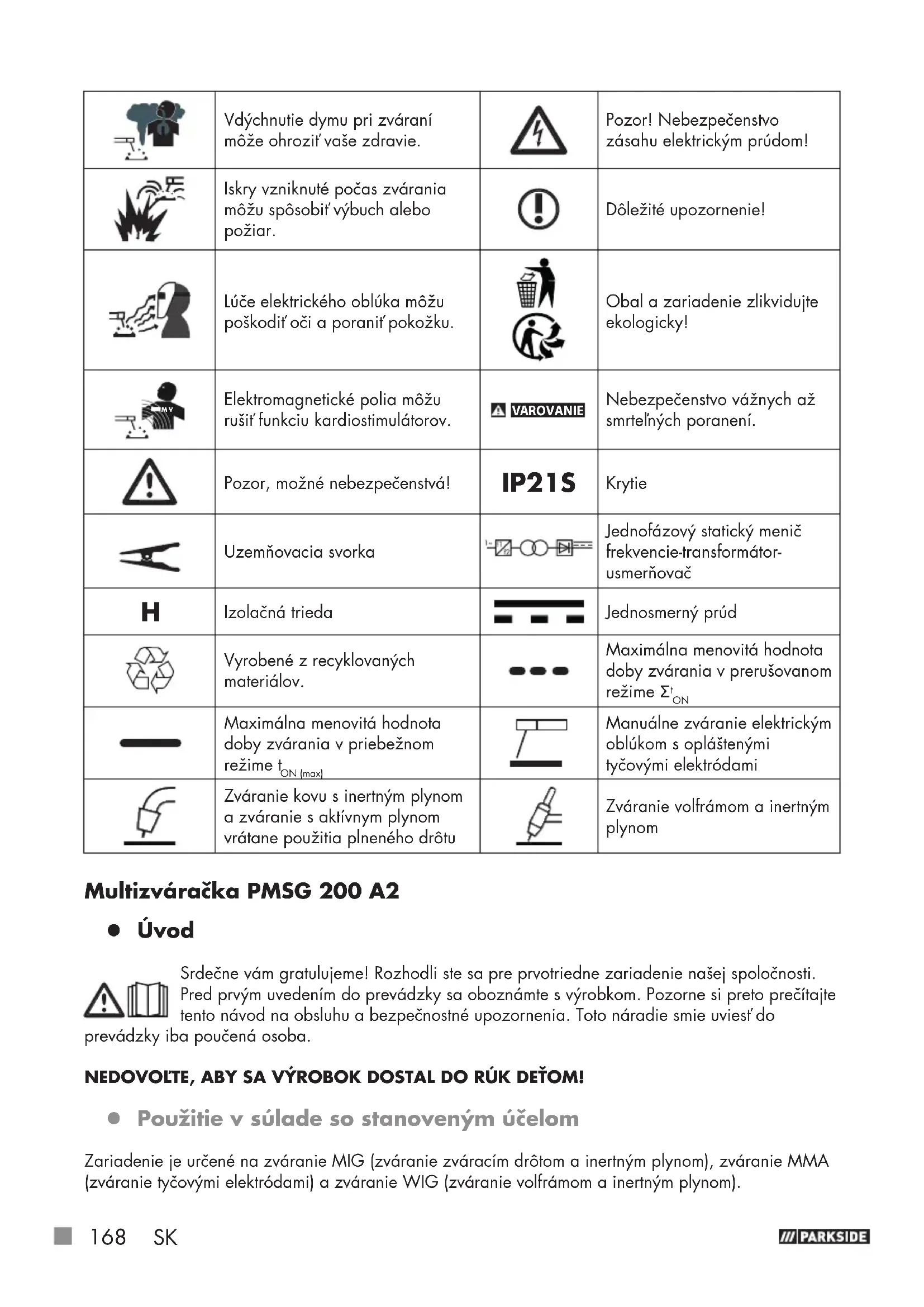 Maximálna menovitá hodnota doby zvárania v priebežnom režime t ON (max) Manuálne zváranie elektrickým oblúkom s opláštenými tyčovými elektródami Zváranie kovu s inertným plynom a zváranie s aktívnym plynom vrátane použitia plneného drôtu Zváranie volfrámom a inertným plynom Multizváračka PMSG 200 A2 z Úvod Srdečne vám gratulujeme! Rozhodli ste sa pre prvotriedne zariadenie našej spoločnosti. Pred prvým uvedením do prevádzky sa oboznámte s výrobkom. Pozorne si preto prečítajte tento návod na obsluhu a bezpečnostné upozornenia. Toto náradie smie uviesť do prevádzky iba poučená osoba. NEDOVOĽTE, ABY SA VÝROBOK DOSTAL DO RÚK DEŤOM! z Použitie v súlade sostanoveným účelom Zariadenie je určené na zváranie MIG (zváranie zváracím drôtom a inertným plynom), zváranie MMA (zváranie tyčovými elektródami) a zváranie WIG (zváranie volfrámom a inertným plynom).SK