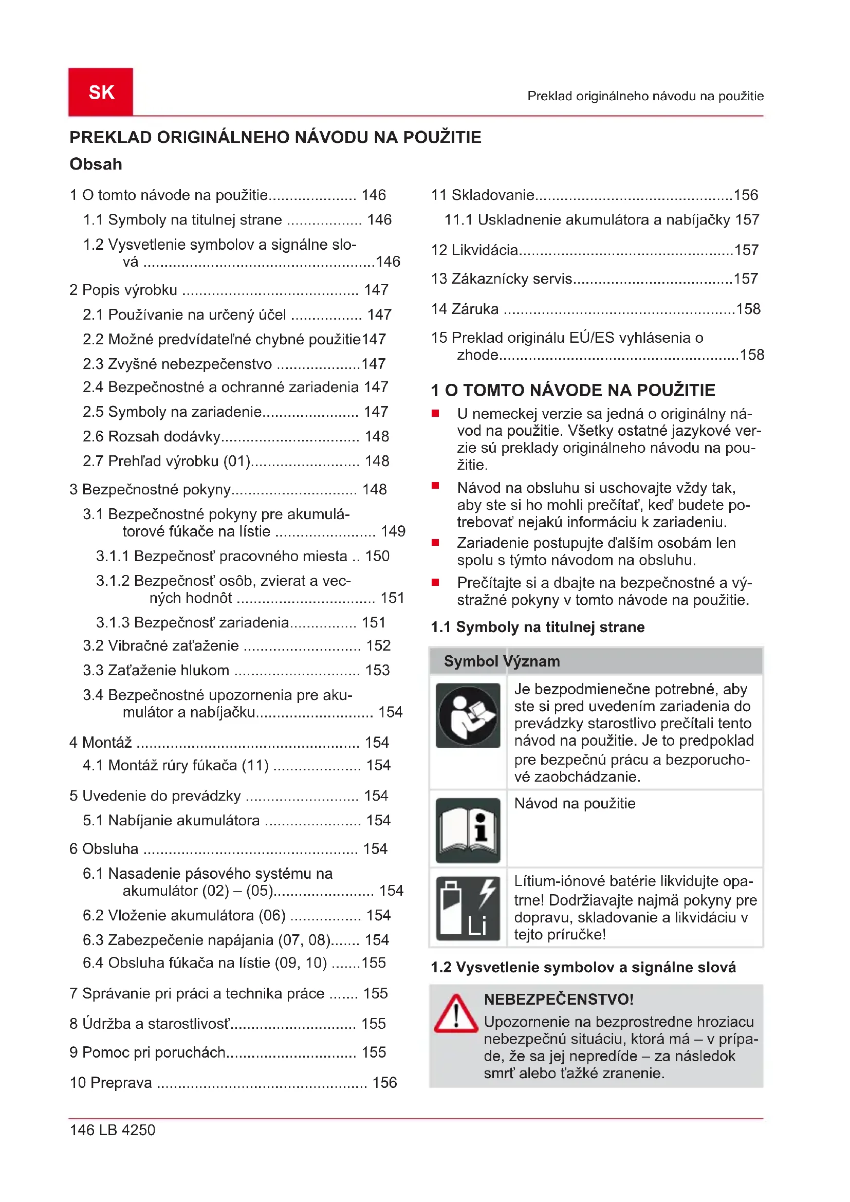 diely podliehajúce opotrebeniu, ktoré sú na karte náhradných dielov označené rámčekom xxxxxx (x) Záručná doba začína plynúť odo dňa zakúpenia zariadenia prvým koncovým odberateľom. Rozhodu- júci je dátum na doklade o zakúpení zariadenia. S týmto vyhlásením o záruke a s originálnym dokla- dom o zakúpení zariadenia sa obráťte na svojho predajcu alebo na najbližší autorizovaný zákaznícky servis. Zákonné nároky kupujúceho voči predávajúcemu vyplývajúce z chýb výrobku zostávajú týmto vyhlásením nedotknuté. 15 PREKLAD ORIGINÁLU EÚ/ES VYHLÁSENIA O ZHODE Týmto vyhlasujeme na výhradnú vlastnú zodpovednosť, že tento produkt vo forme, v akej sa predáva na trhu, spĺňa podmienky harmonizovaných smerníc EÚ, bezpečnostných štandardov EÚ a štandar- dov špecifických pre produkt. Výrobok Akumulátorový fúkač na lístie Sériové číslo G2043022 Výrobca AL-KO Geräte GmbH Ichenhauser Str. 14 D-89359 Kötz Dokumentácia - oprávnená osoba Andreas Hedrich Ichenhauser Str. 14 D-89359 Kötz Typ LB 4250 Hladina hluku EN ISO 3744 nameraný/garantovaný 98 dB(A) / 101 dB(A) Smernice EÚ 2006/42/ES 2014/30/EÚ 2000/14/ES 2011/65/EÚ Posúdenie zhody 2000/14/ES, príloha VI Harmonizované normy EN 60335-1:2012+A11:2014 EN 50636-2-100:2014 EN 62233:2008 EN 55014-1:2006+A1:2009 +A2 2011 EN 55014-2:2015 EN ISO 12100:2010 Kötz, dňa 19. 06. 2018 Dr. Wolfgang Hergeth Managing Director442509_a 159 Az eredeti kezelési útmutató fordítása AZ EREDETI KEZELÉSI ÚTMUTATÓ FORDÍTÁSA Tartalomjegyzék 1 Ehhez a kezelési útmutatóhoz................. 159
