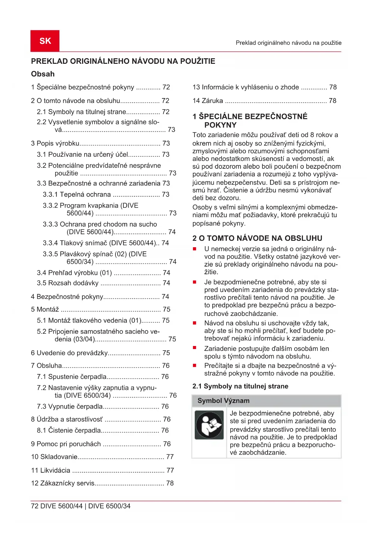 Aby pri prečerpávaní veľmi malého množstva vo- dy (napr. kvapkanie vedenia) nedošlo k predčas- nému vypnutiu čerpadla, aktivuje sa program kvapkania. Vykoná sa pritom 7 štartovacích pokusov v prie- behu 150 sekúnd. Následne sa čerpadlo vypne. Po krátkom čase sa proces zopakuje. Ak budú ďalšie štartovacie pokusy (po jednej hodine) ne- úspešné, čerpadlo sa vypne. Za účelom opätovného spustenia čerpadla musí byť sieťová zástrčka vytiahnutá a znovu zastrče- ná.SK 74 DIVE 5600/44 | DIVE 6500/34 Bezpečnostné pokyny