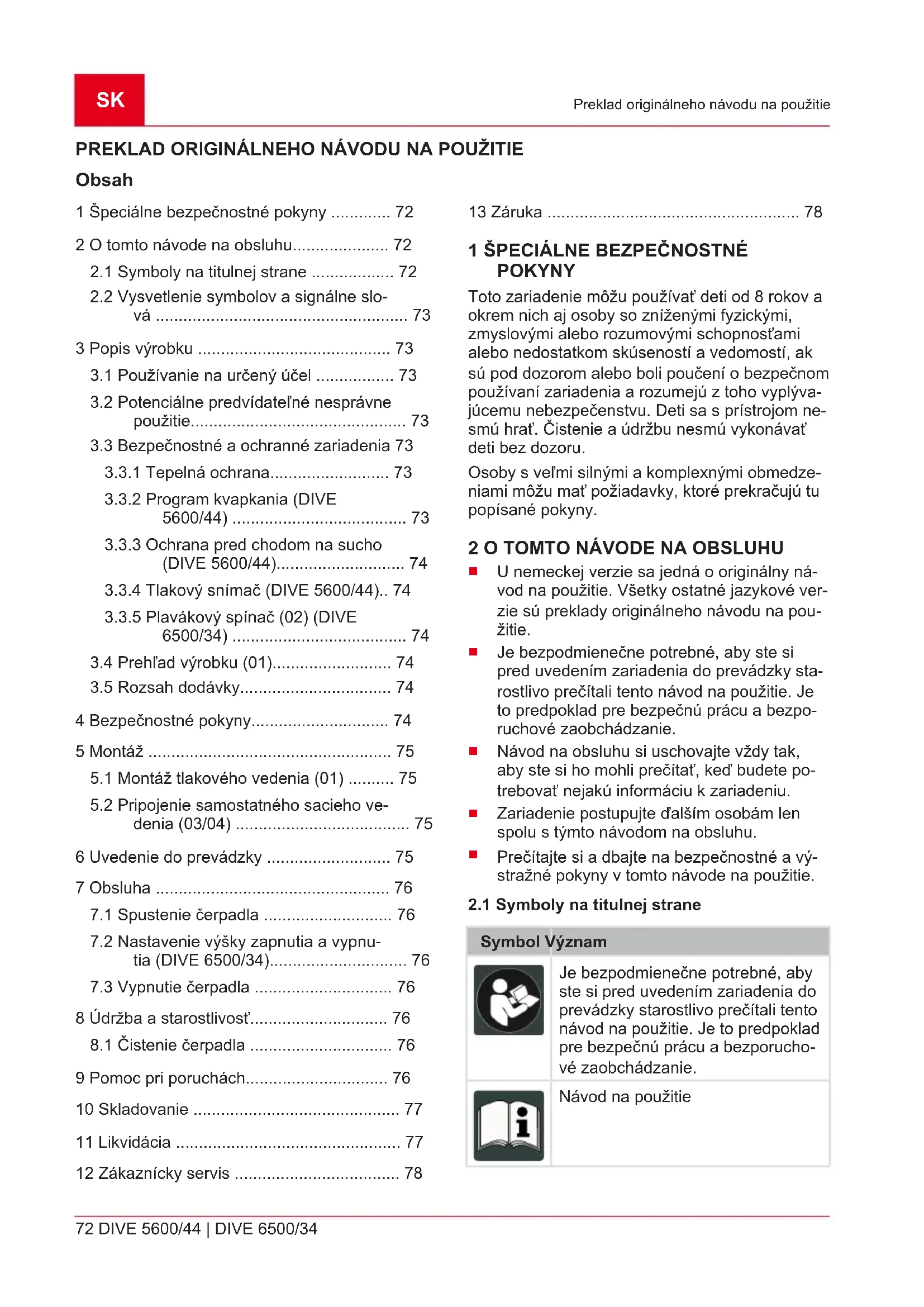 Aby pri prečerpávaní veľmi malého množstva vo- dy (napr. kvapkanie vedenia) nedošlo k predčas- nému vypnutiu čerpadla, aktivuje sa program kvapkania. Vykoná sa pritom 7 štartovacích pokusov v prie- behu 150 sekúnd. Následne sa čerpadlo vypne. Po krátkom čase sa proces zopakuje. Ak budú ďalšie štartovacie pokusy (po jednej hodine) ne- úspešné, čerpadlo sa vypne. Za účelom opätovného spustenia čerpadla musí byť sieťová zástrčka vytiahnutá a znovu zastrče- ná.SK 74 DIVE 5600/44 | DIVE 6500/34 Bezpečnostné pokyny